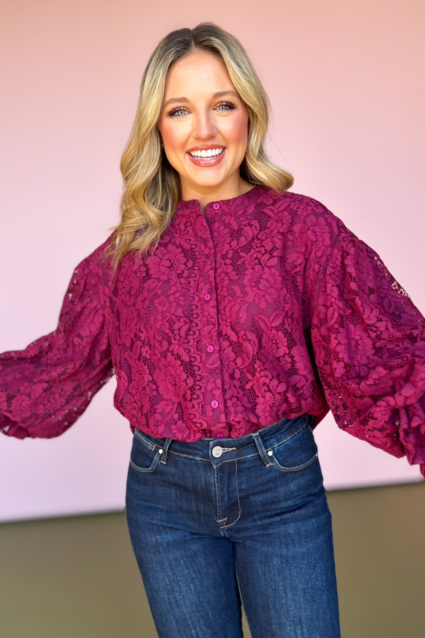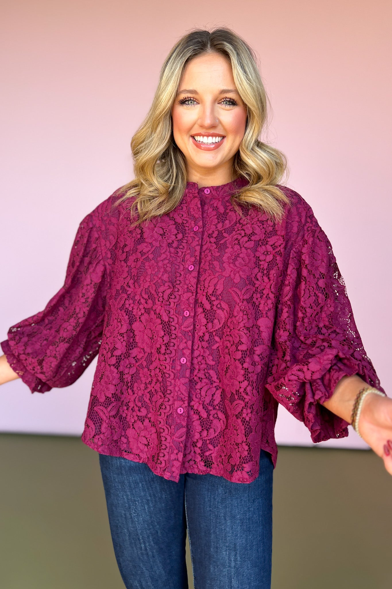 Maroon Lace Bubble Sleeve Button Front Top *FINAL SALE*