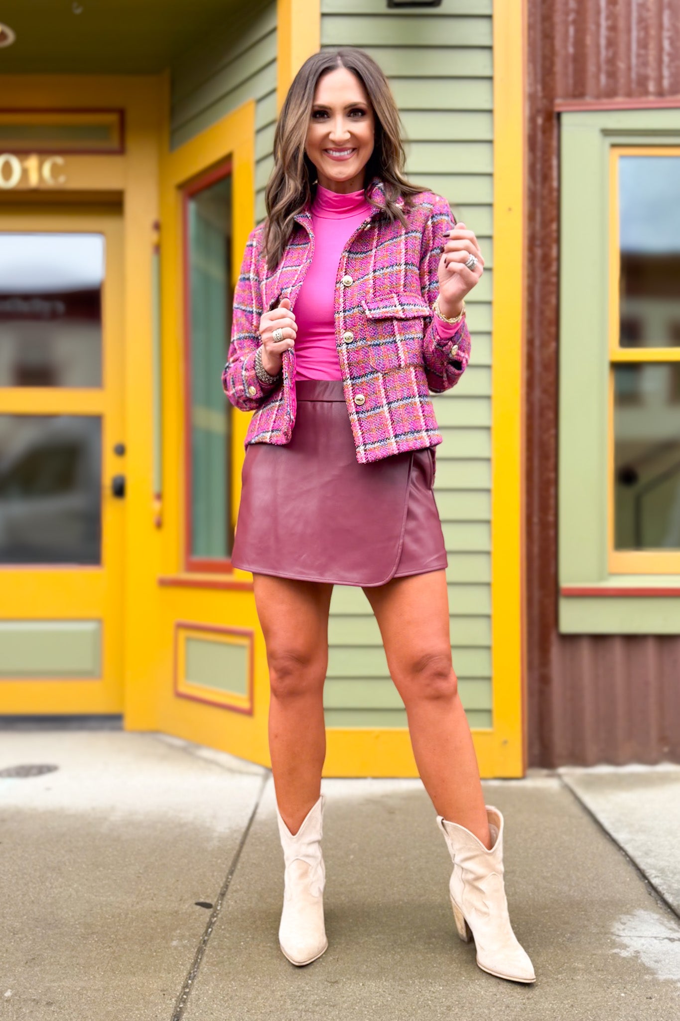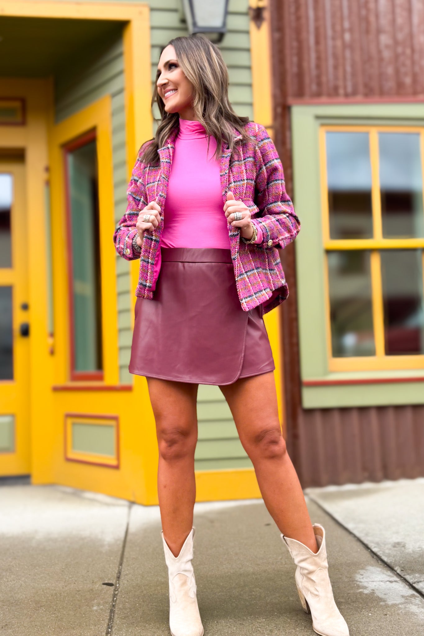 The SSYS Lindsey Faux Leather Skort In Maroon needs a MOMENT ladies! A BRAND NEW SILHOUETTE that will carry you through fall and winter. Lindsey is so CHIC, giving you that effortless edgy look no matter how you style her. With an elastic back, she is comfortable and flattering in all the right places. Let SSYS The Lindsey do all the work for you! Style her our SSYS Signature Long Sleeve Turtleneck In Black for a sleek and chic outfit perfect for date night or a girls night out on the town!