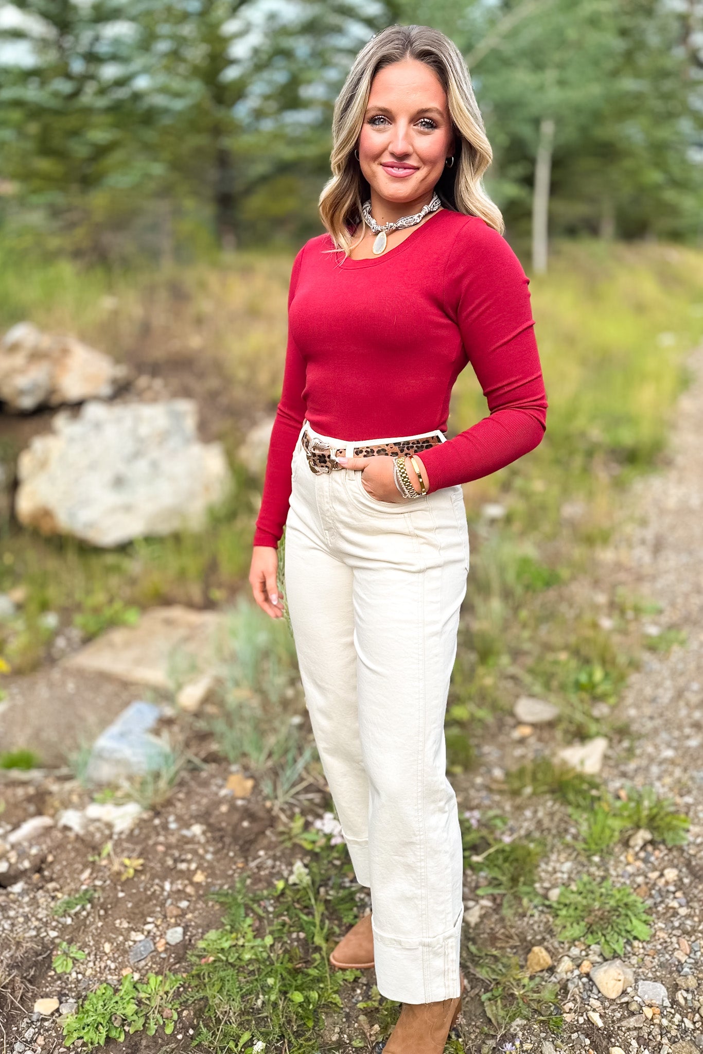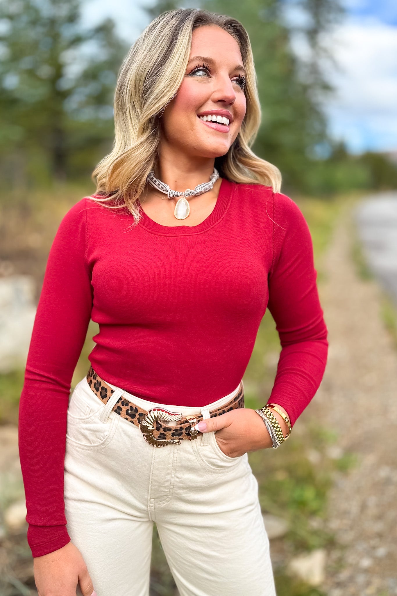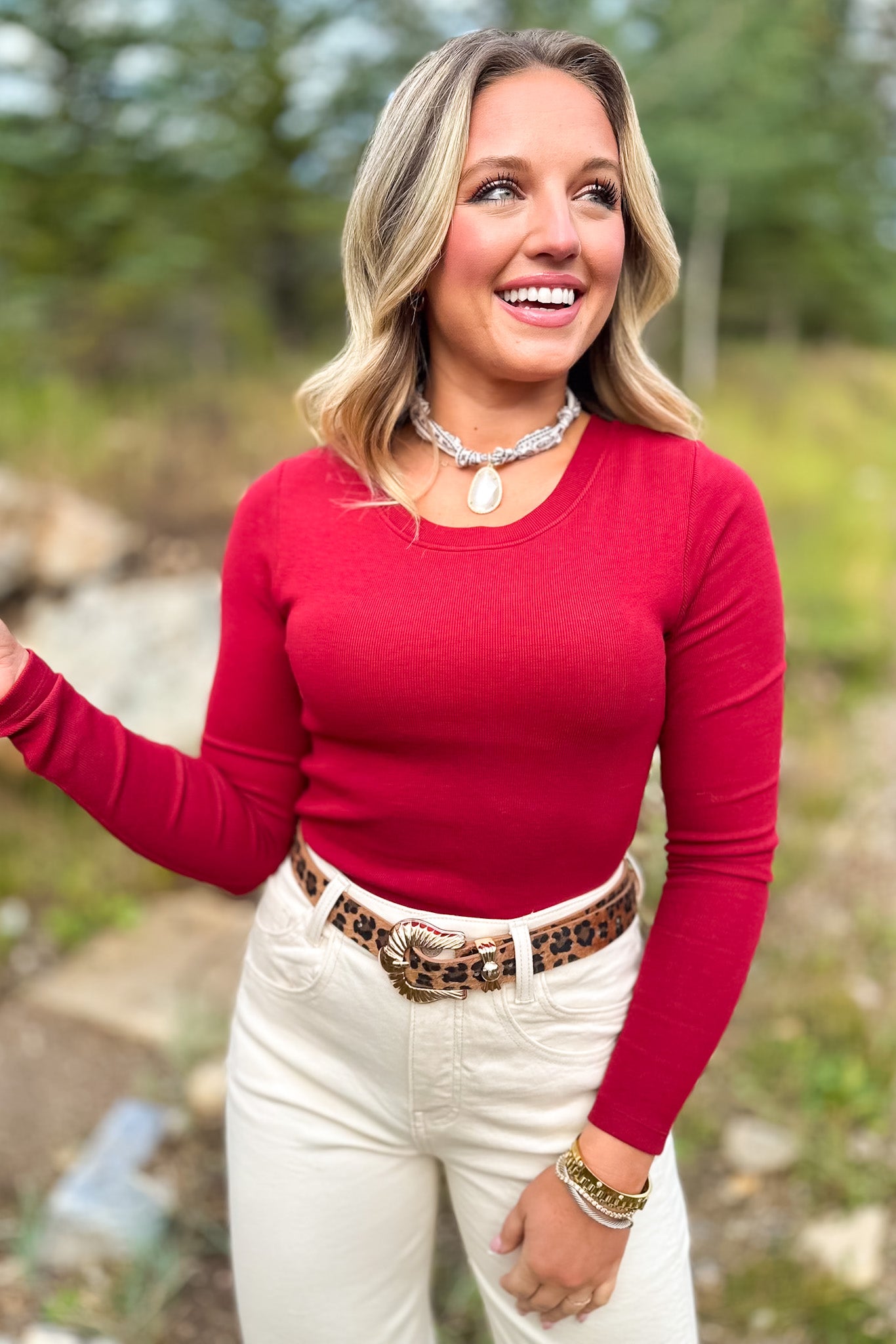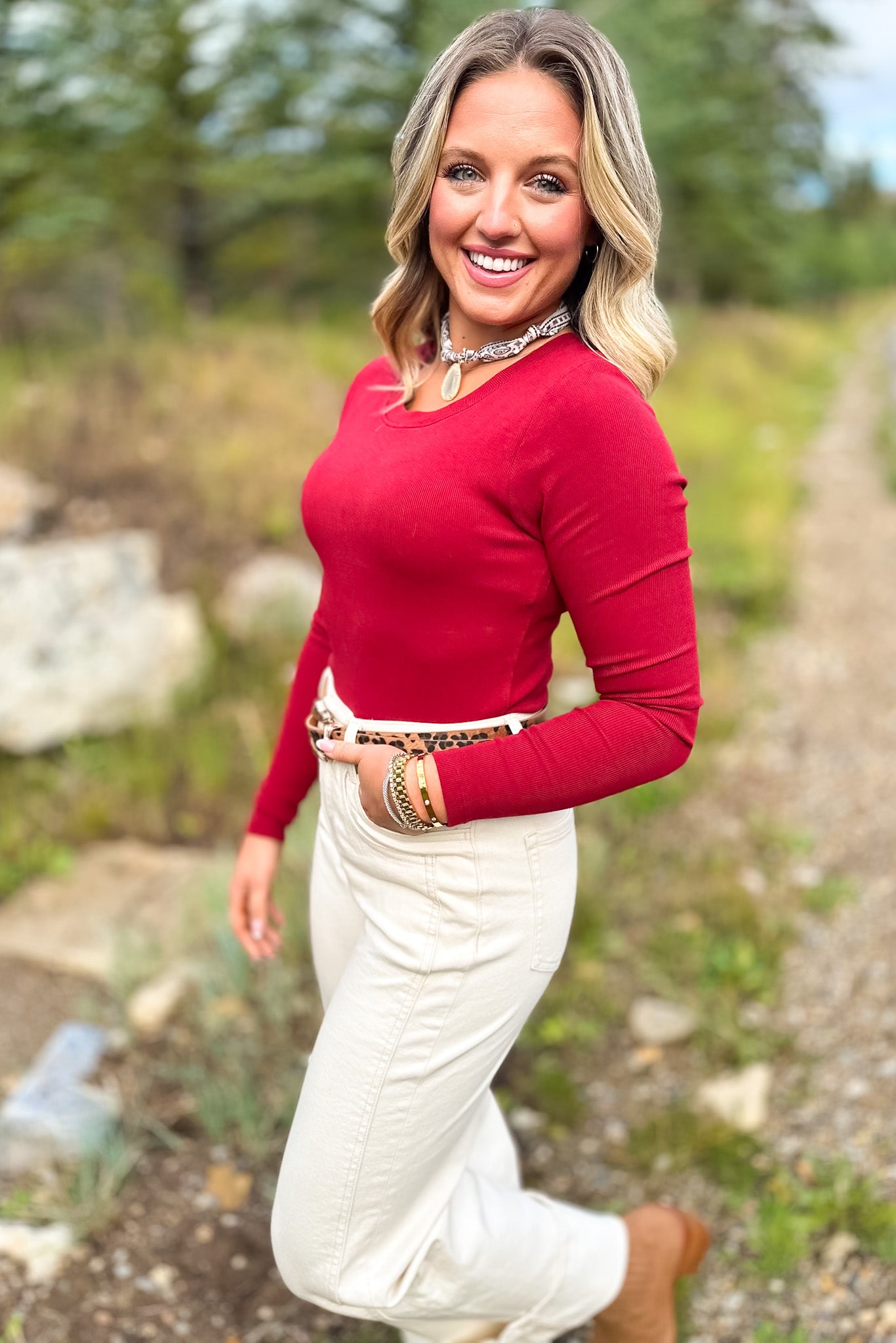 A true wardrobe essential, the Ribbed Crew Neck Long Sleeve Top in Maroon by SSYS The Label combines timeless simplicity with elevated comfort. Made from a soft ribbed knit with a touch of stretch, this fitted top flatters the figure while allowing for easy movement. Plus, the built in bra makes this an essential in your closet. The classic crew neckline and sleek long sleeves make it a versatile piece you’ll reach for again and again.