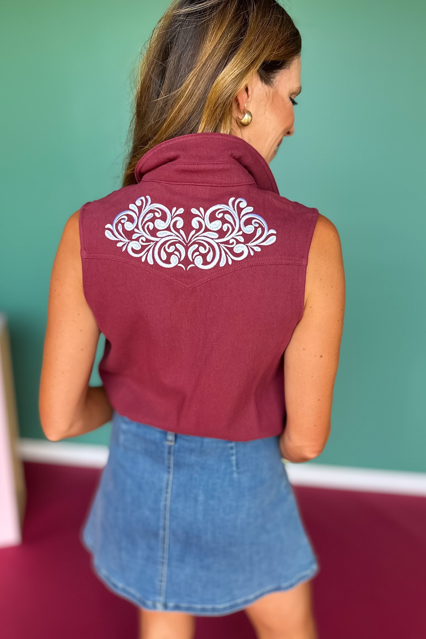 Say HELLO to the SSYS Edith Sleeveless Denim Embroidered Top in Maroon — a western inspired yet polished favorite for the fall season. Made from breathable lightweight denim, this sleeveless silhouette is adorned with a one-of-a-kind embroidered design and pearl buttons for an effortlessly elevated touch! This top is your go-to for standout versatility—whether you're in the stands, on the concert lawn, or out on the town. Create a concert or game day ready look by pairing with our SSYS Arden Denim Skort In Ivory and boots. This piece NEEDS in your closet ASAP!