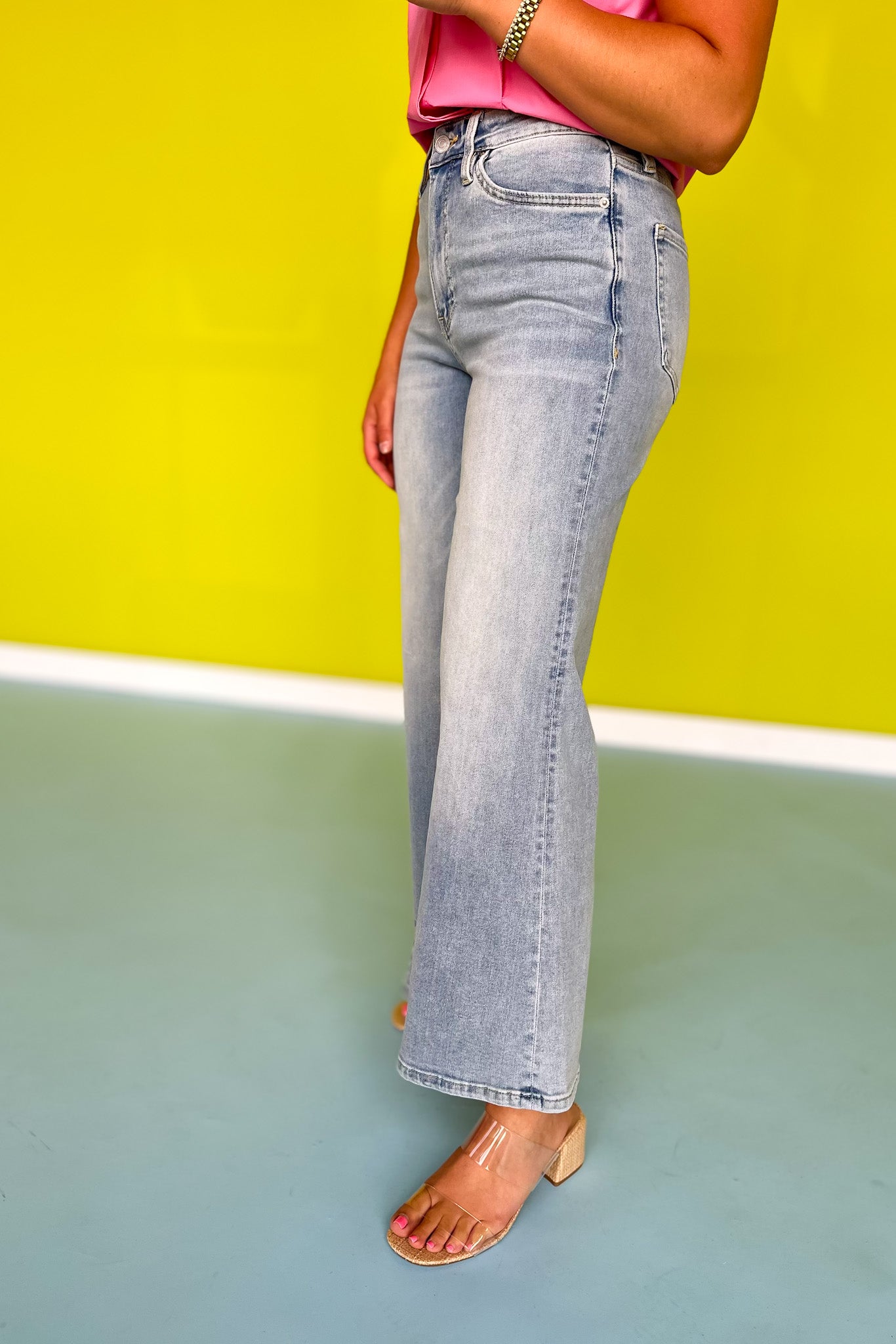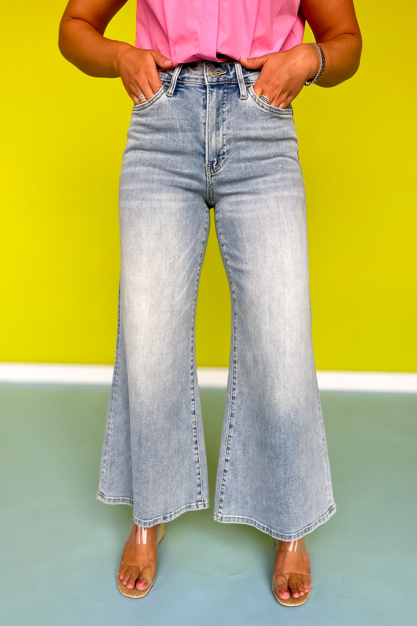 Introducing Mica High Rise Super Wide Leg Palazzo Crop Jeans for a bold and fashionable look. Boasting a high rise design and super wide leg cut, these jeans bring a modern, trend forward twist to a classic style. Perfect for making a statement and standing out in the crowd! Need styling inspiration? Shop our in stock and versatile collection of TOPS and SHOES to build your multiple looks!