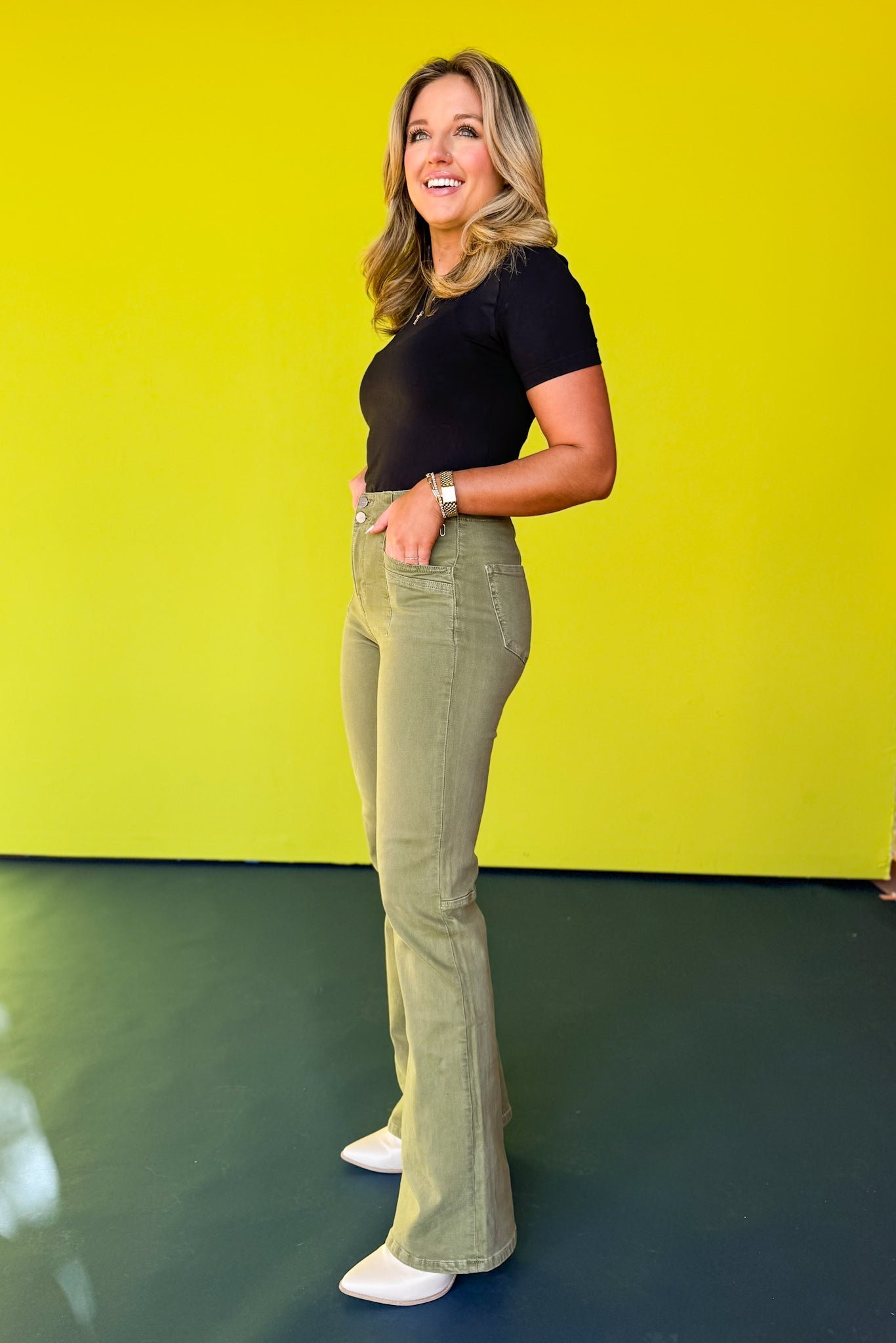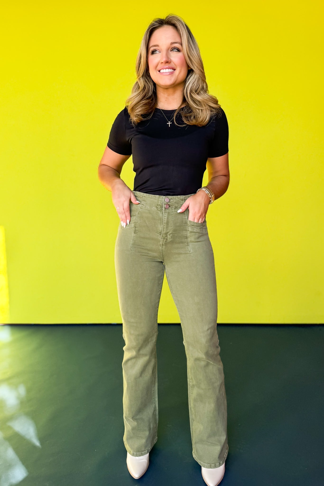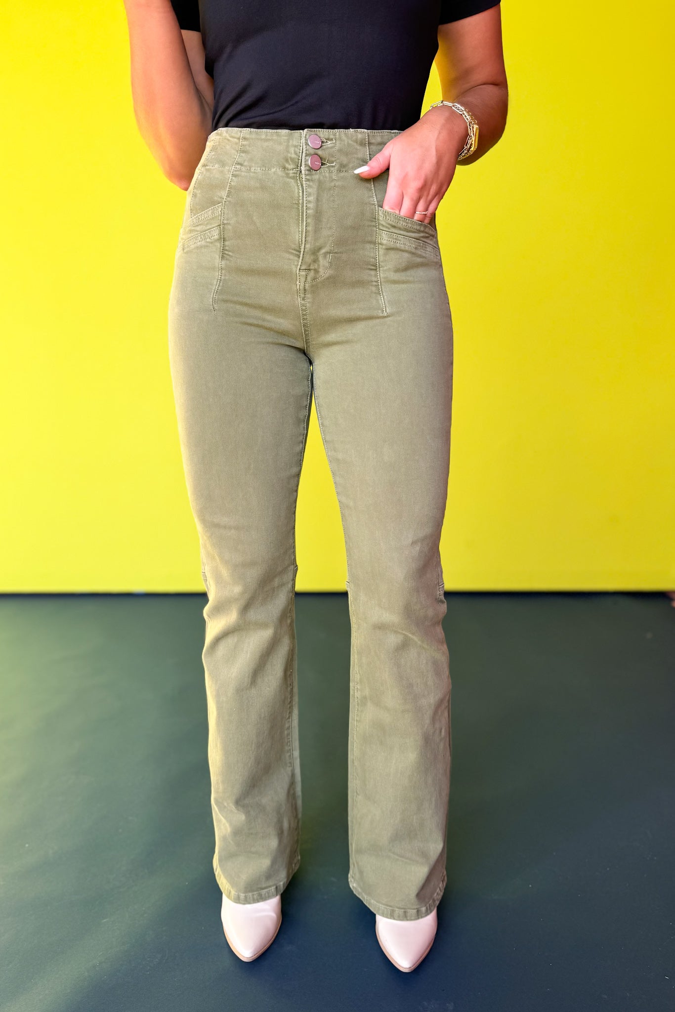 Our Mica Moss Green Super High-Rise Jeans are the perfect piece to bring out a little color in your wardrobe! Show off your style with these double-button, pocket-detail flares that'll keep you comfy all day long! Get ready to style these through all seasons!