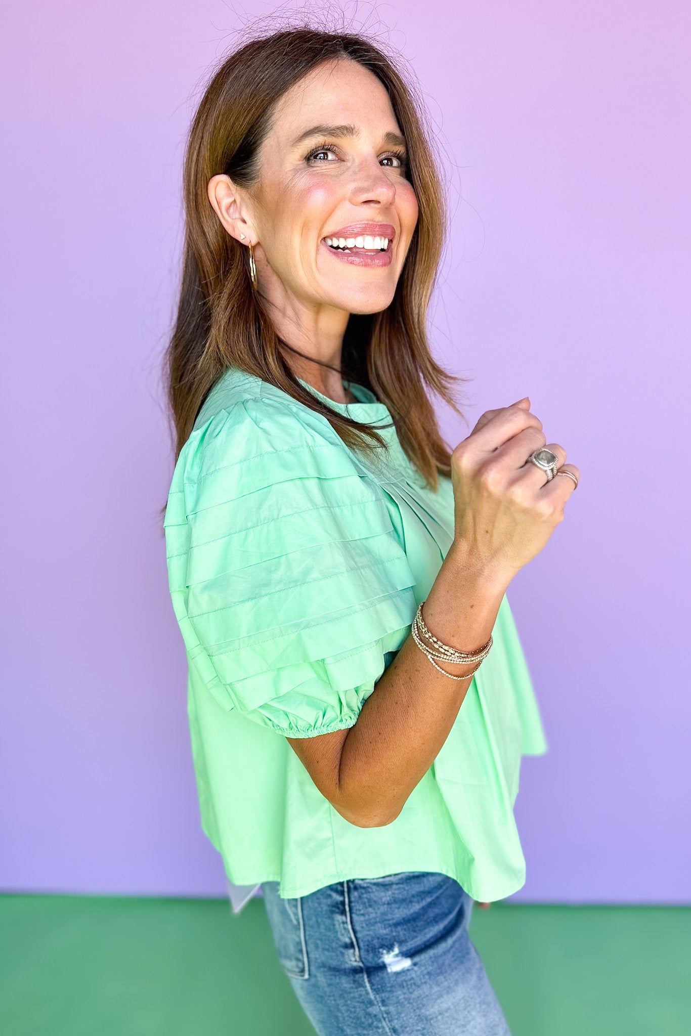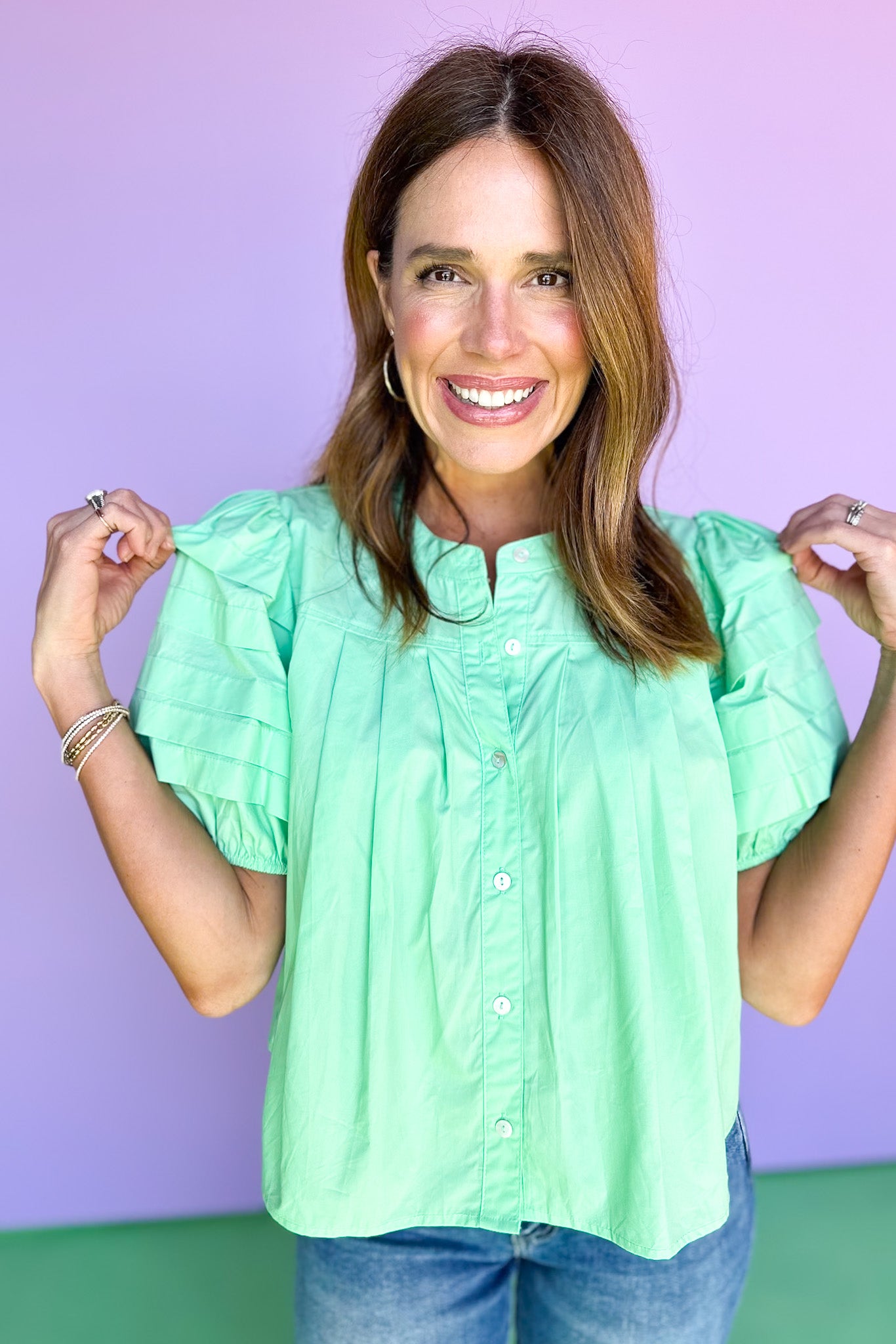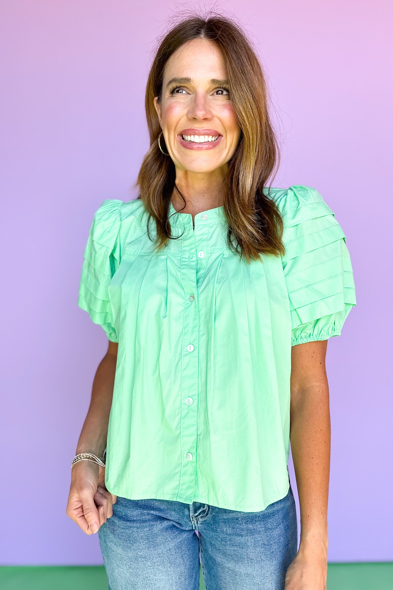 Introducing our next throw on and go piece - the Mint Pleated Button Down Short Puff Sleeve Top! Its unique design and classic button front make it a stand-out piece. The pleated fabric adds a touch of sophistication, while the puff sleeves add a fun twist. Perfect for adding some flair to your wardrobe! Need styling inspiration? Shop our BOTTOMS and SHOES for your perfect ensemble!