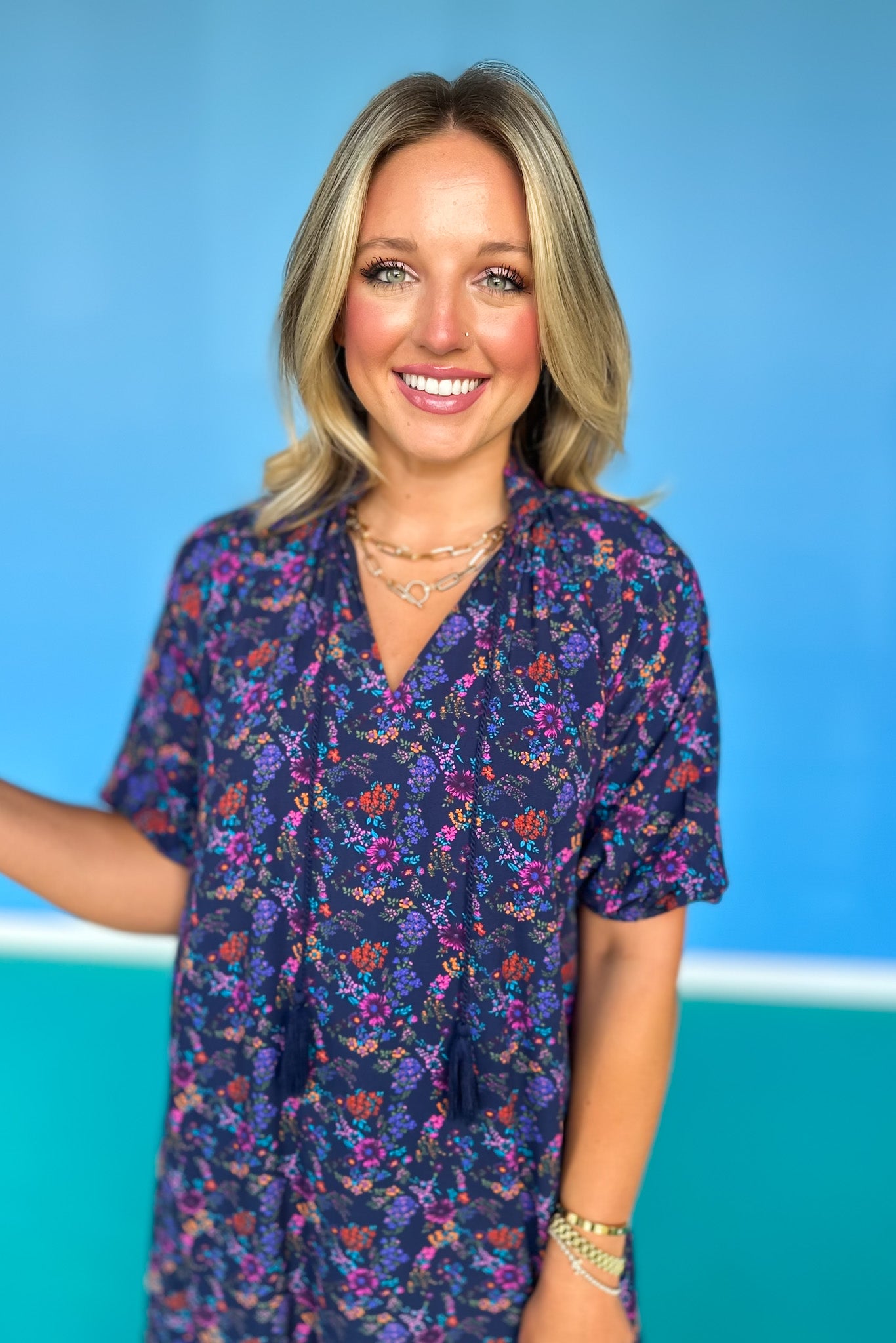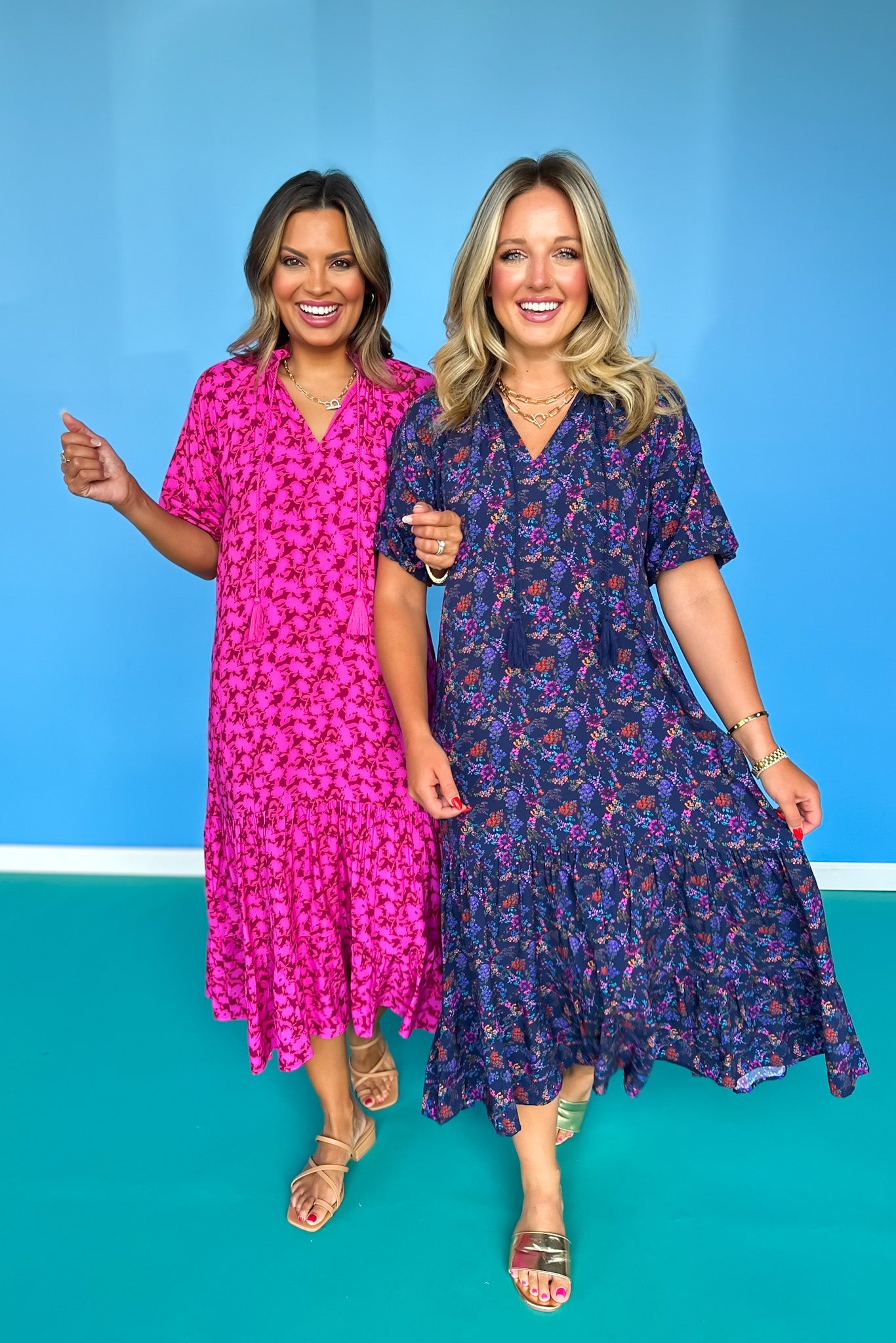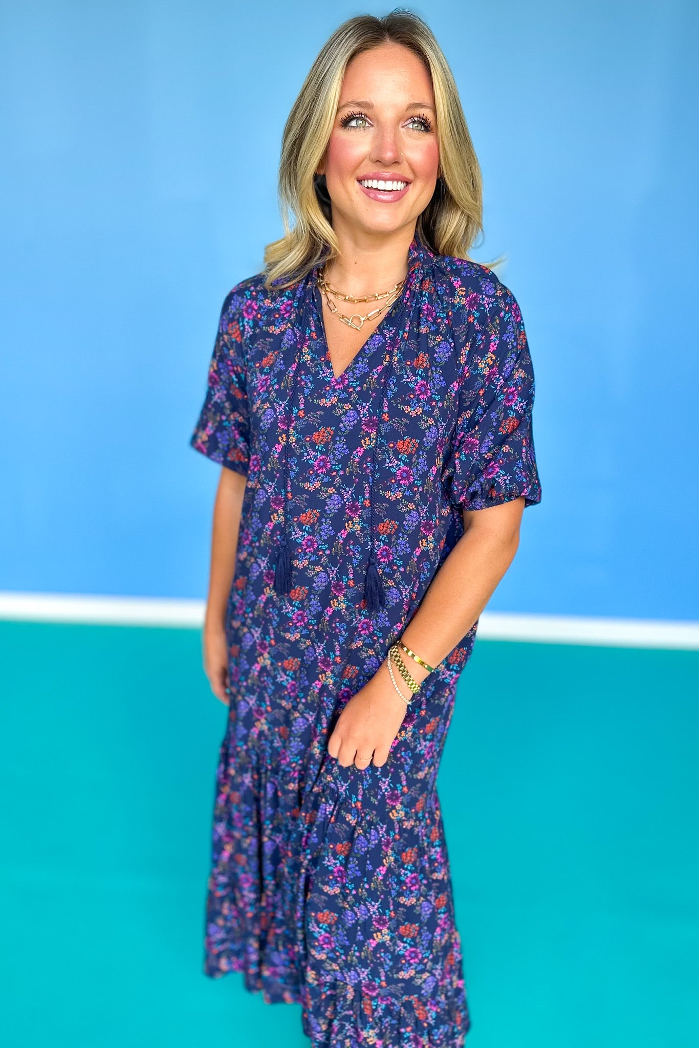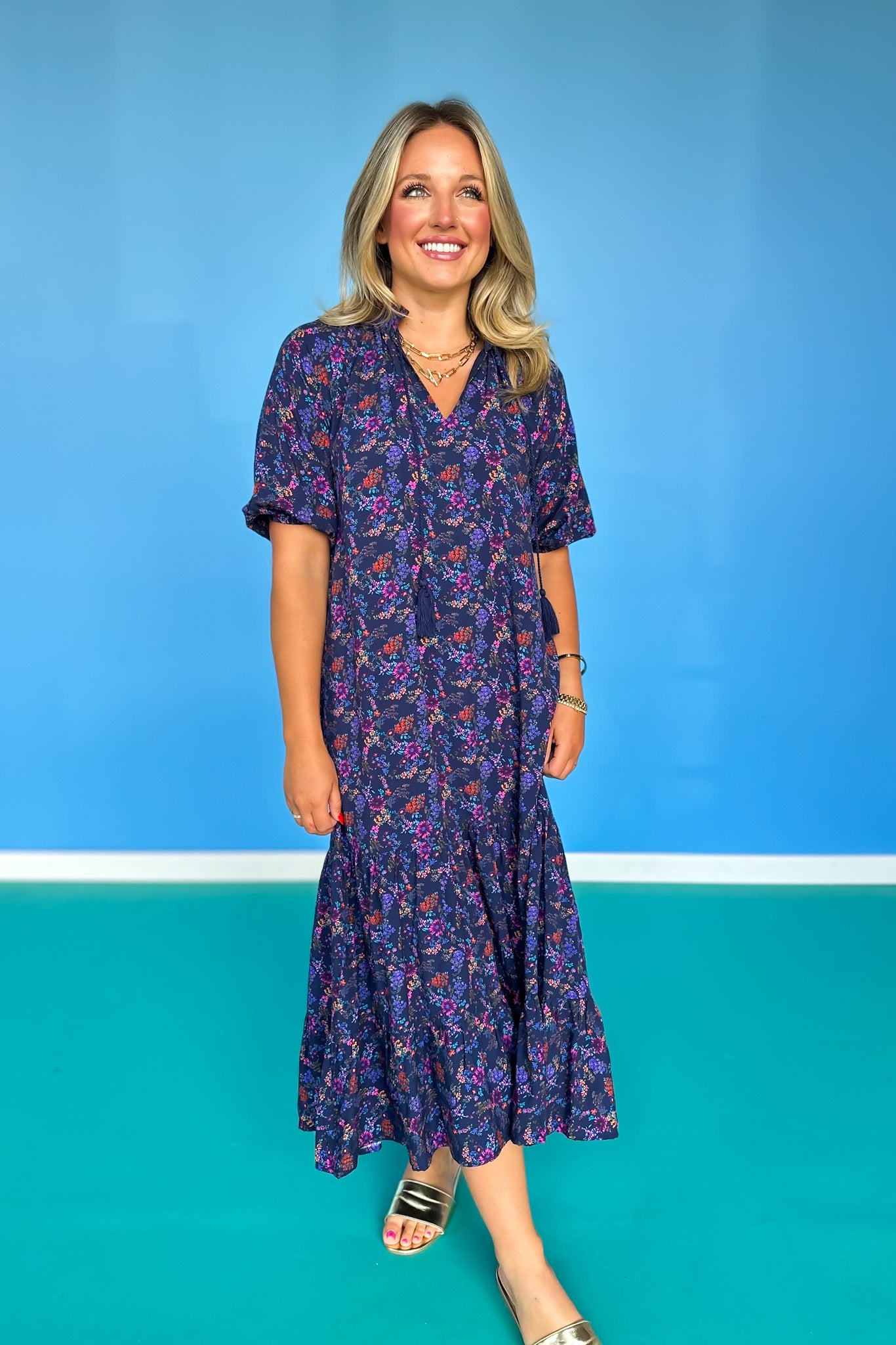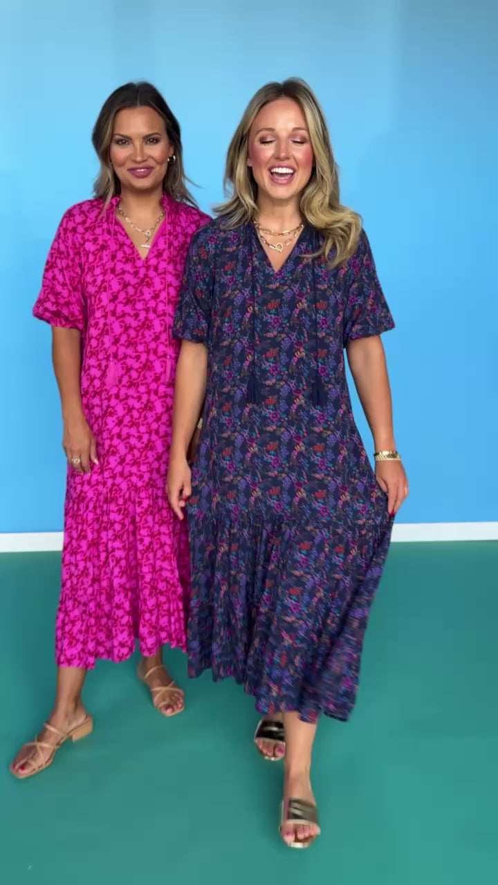 NEW SILHOUETTE ALERT!!! Turn heads in the SSYS Rowan Short Sleeve Maxi Dress In Navy Floral. This effortless silhouette features a flattering frill v-neckline, subtle empire waist, and fluttery elastic short sleeves for a feminine, floaty feel. The dreamy navy floral print adds rich color and dimension, while the tiered ruffle hem brings extra movement and charm. It’s the perfect transition dress into fall—fully lined and comfortable enough for all-day wear. Whether you're headed to the office, church, a shower, or a luncheon, the Rowan is an easy, elevated go-to! Shop our SHOES and ACCESSORIES to polish off your look!
