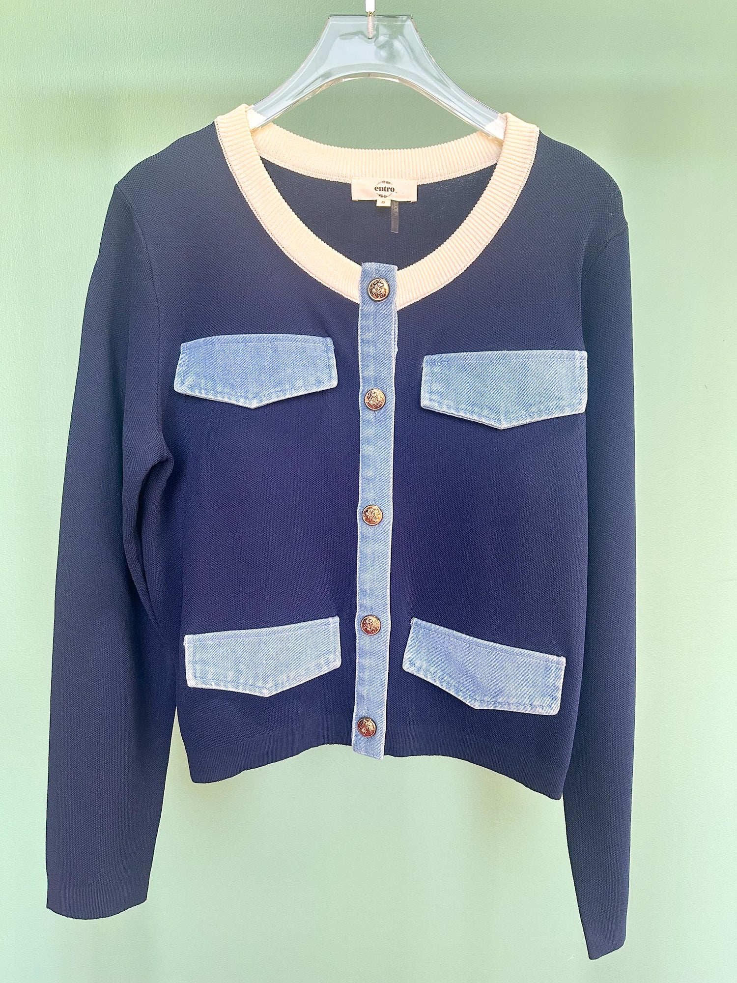 Navy Long Sleeve Contrast Denim Front Button Pocket Flap Cardigan Top *FINAL SALE*