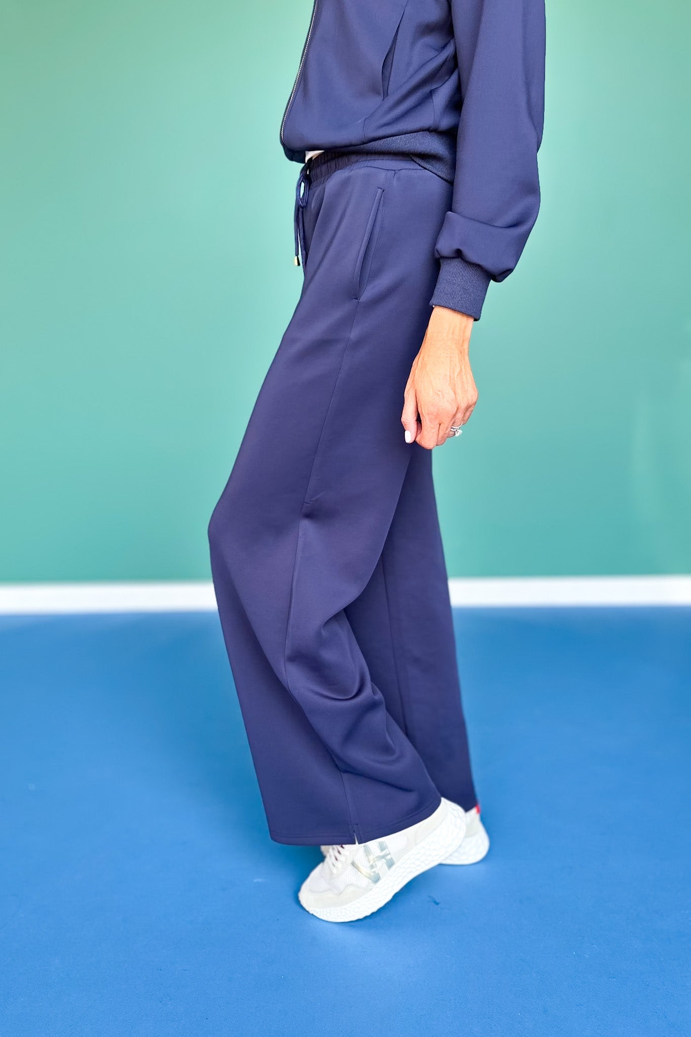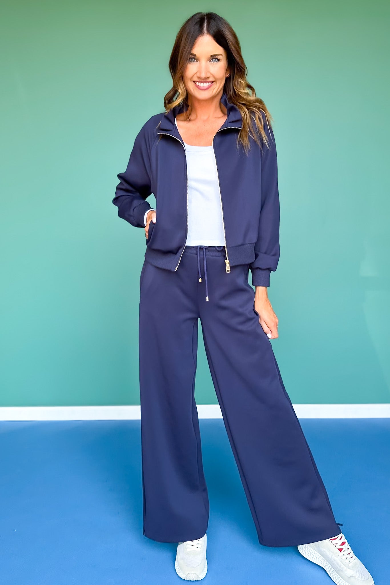 Discover the perfect balance of comfort and polish with the Navy Scuba Wide Leg Pant by SSYS The Label. Designed in a luxe scuba knit fabric, these pants offer a smooth, structured drape with just the right amount of stretch. The wide-leg silhouette flatters every figure, while the adjustable drawstring waistband adds a touch of casual ease without sacrificing style.