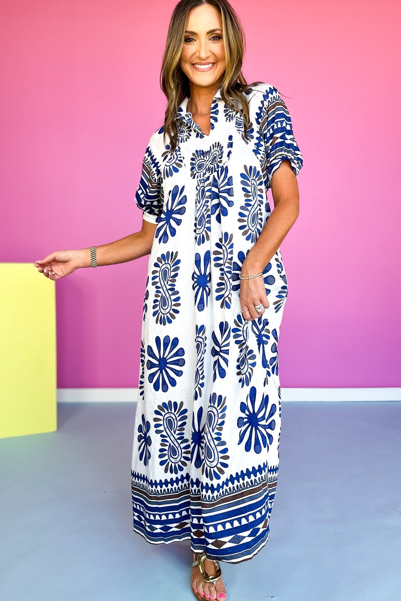 Navy Printed Smocked Yoke Balloon Sleeve Midi Dress