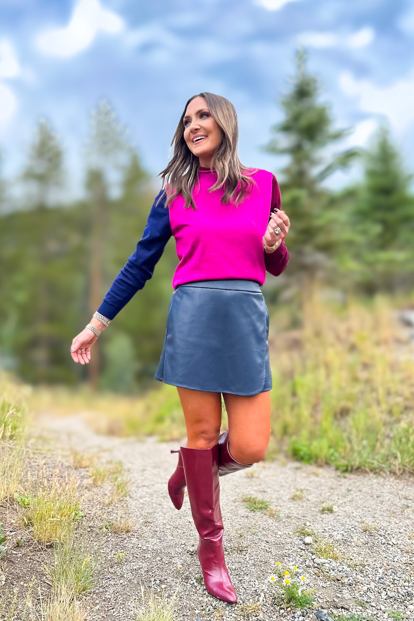 The SSYS Lindsey Faux Leather Skort In Navy needs a MOMENT ladies! A BRAND NEW SILHOUETTE that will carry you through fall and winter. Lindsey is so CHIC, giving you that effortless edgy look no matter how you style her. With an elastic back, she is comfortable and flattering in all the right places. Let SSYS The Lindsey do all the work for you! Style her our SSYS Signature Long Sleeve Turtleneck In Black for a sleek and chic outfit perfect for date night or a girls night out on the town!
