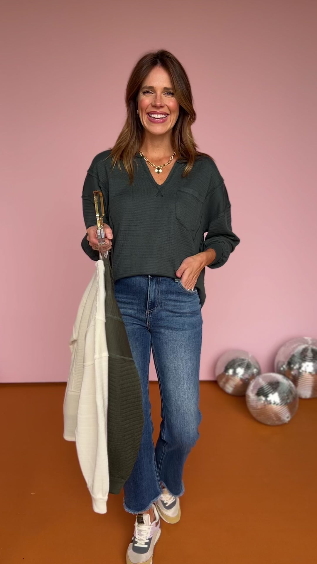 This Off White Knit Top is a game changer for your everyday throw on and go rotation. Its solid patchwork detail and split neck design add character to any outfit. Style with your favorite denim and tackle the day in effortless style. Shop our DENIM and SHOES to build your ensemble!