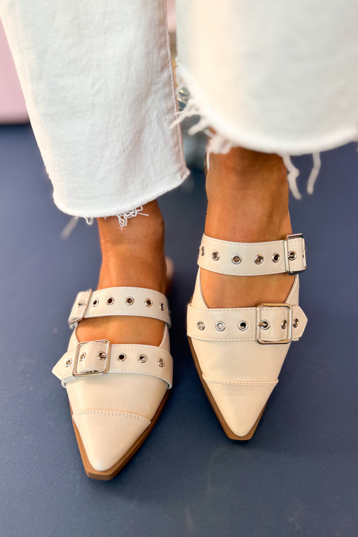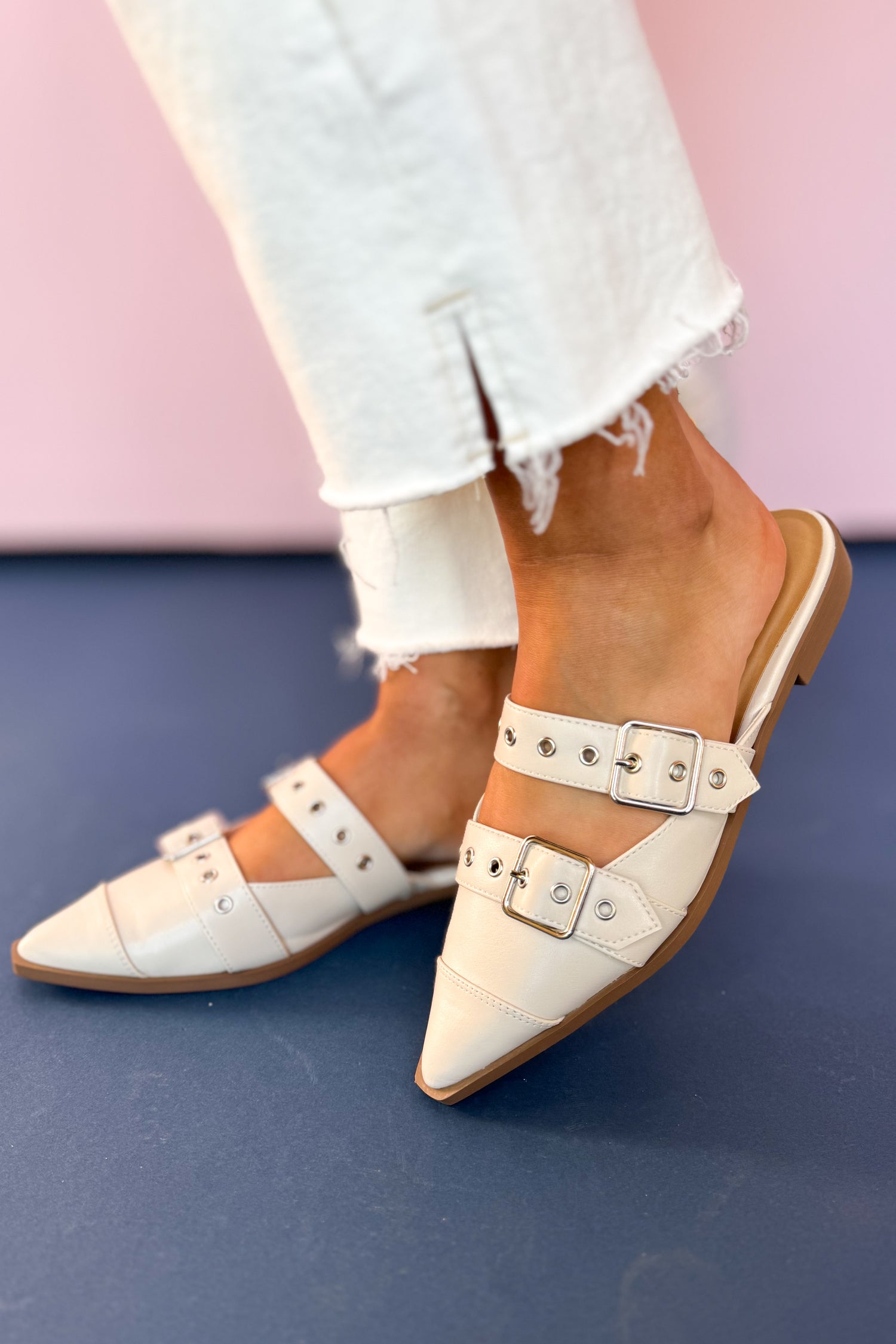 Put your best foot forward with these unique Off White Pointed Double Buckle Mule Shoes. The pointed design and double buckle add edgy flair to any outfit, while the off white color keeps things fresh and modern. Step out in style and stand out from the crowd with these must-have shoes!