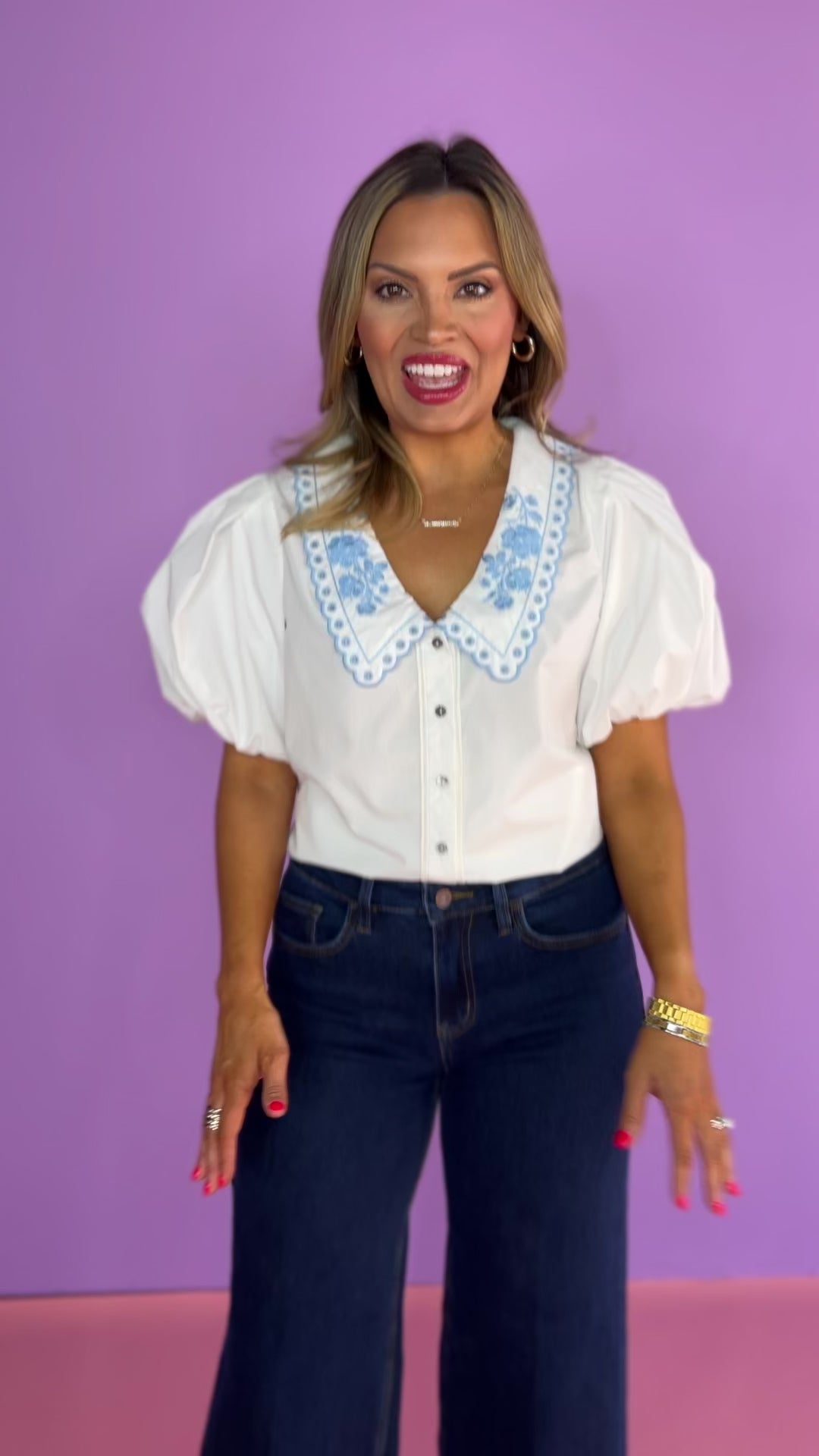 Be darling and sophisticated with our Off White Poplin Top! The short bubble sleeves add feminine flair, while the embroidered chelsea collar adds a whimsy touch. Versatile for both day and night, this top will have you feeling confident and stylish! Style with denim for a casual vibe or elevate with a maxi skirt! Shop our BOTTOMS and SHOES to complete your look!