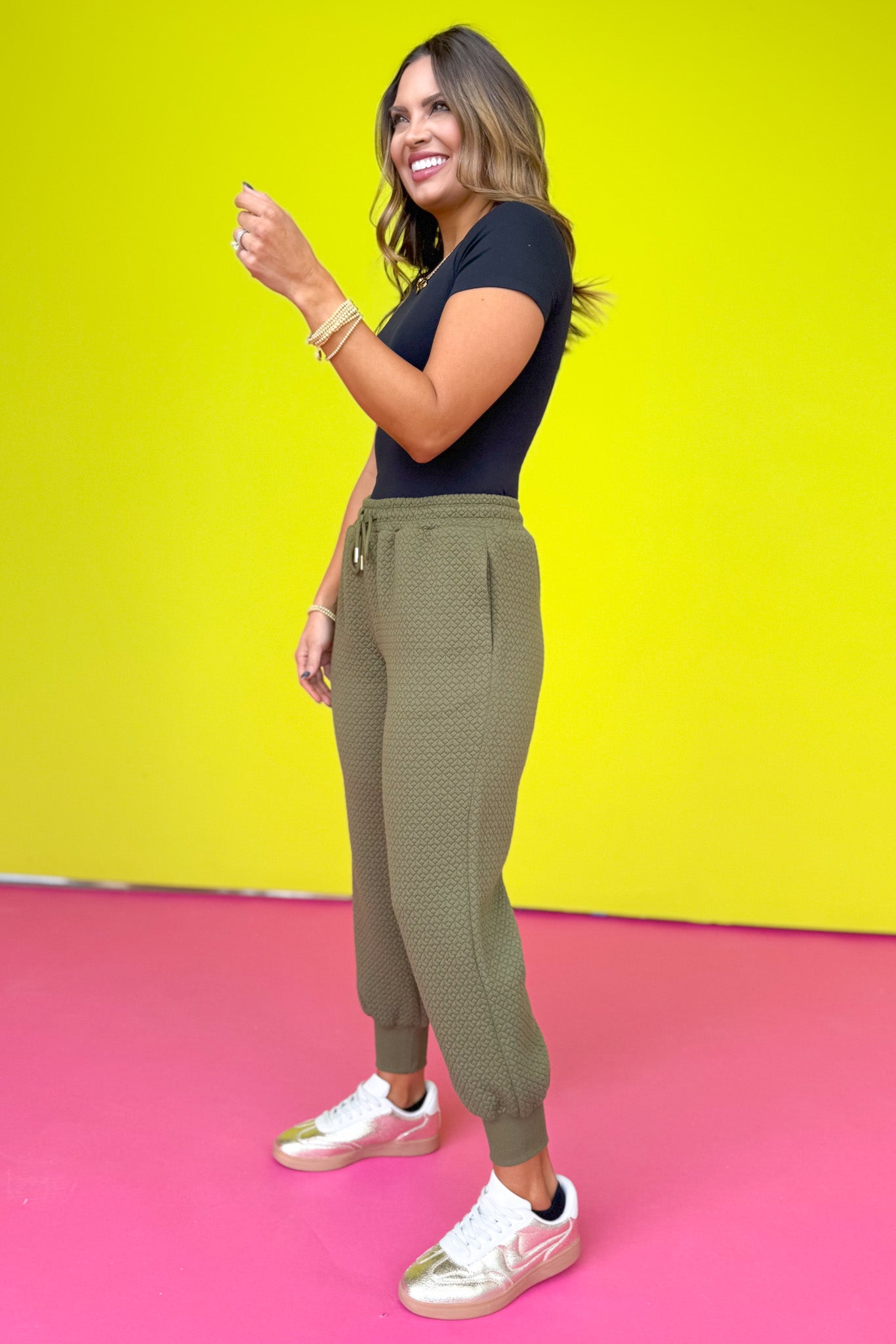 DOESN'T GET BETTER THEN THIS! Introducing the SSYS Tyler Diamond Quilted Olive Joggers!!! The response to the original SSYS Tyler Shacket was through the roof, so we had to bring it back in an updated form and add to the play! Y'all loved our signature diamond quilted fabric as much as we do, so why not make it into joggers?! Perfectly designed to pair with the matching SSYS Tyler Cropped Diamond Quilted Olive Shacket to make a chic set, but don't stop there! The styling options are flexible and endless! You know and love the SSYS Tyler, so add to the play and the possibilities are ENDLESS!