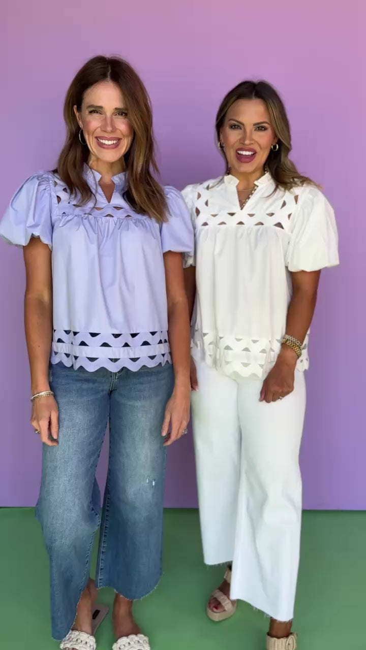 Turn heads in the Periwinkle Scallop Inset Yoke Hem Short Bubble Sleeve Top! With its unique design featuring a frill v neck and bubble short sleeves, this top is both playful and stylish. The scallop inset yoke and hem adds a touch of uniqueness, making this top perfect for any occasion. Shop our BOTTOMS and SHOES to complete your ensemble.