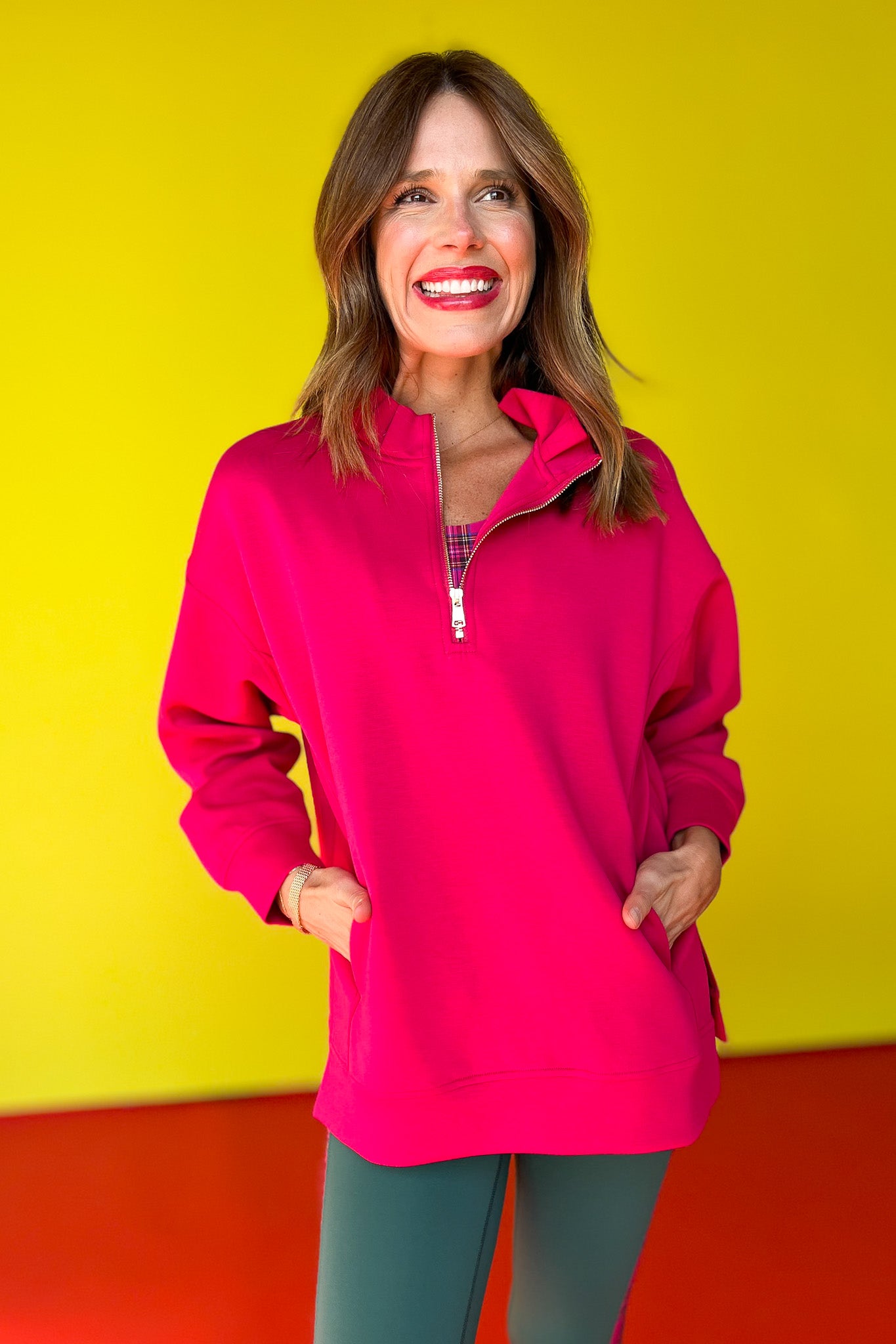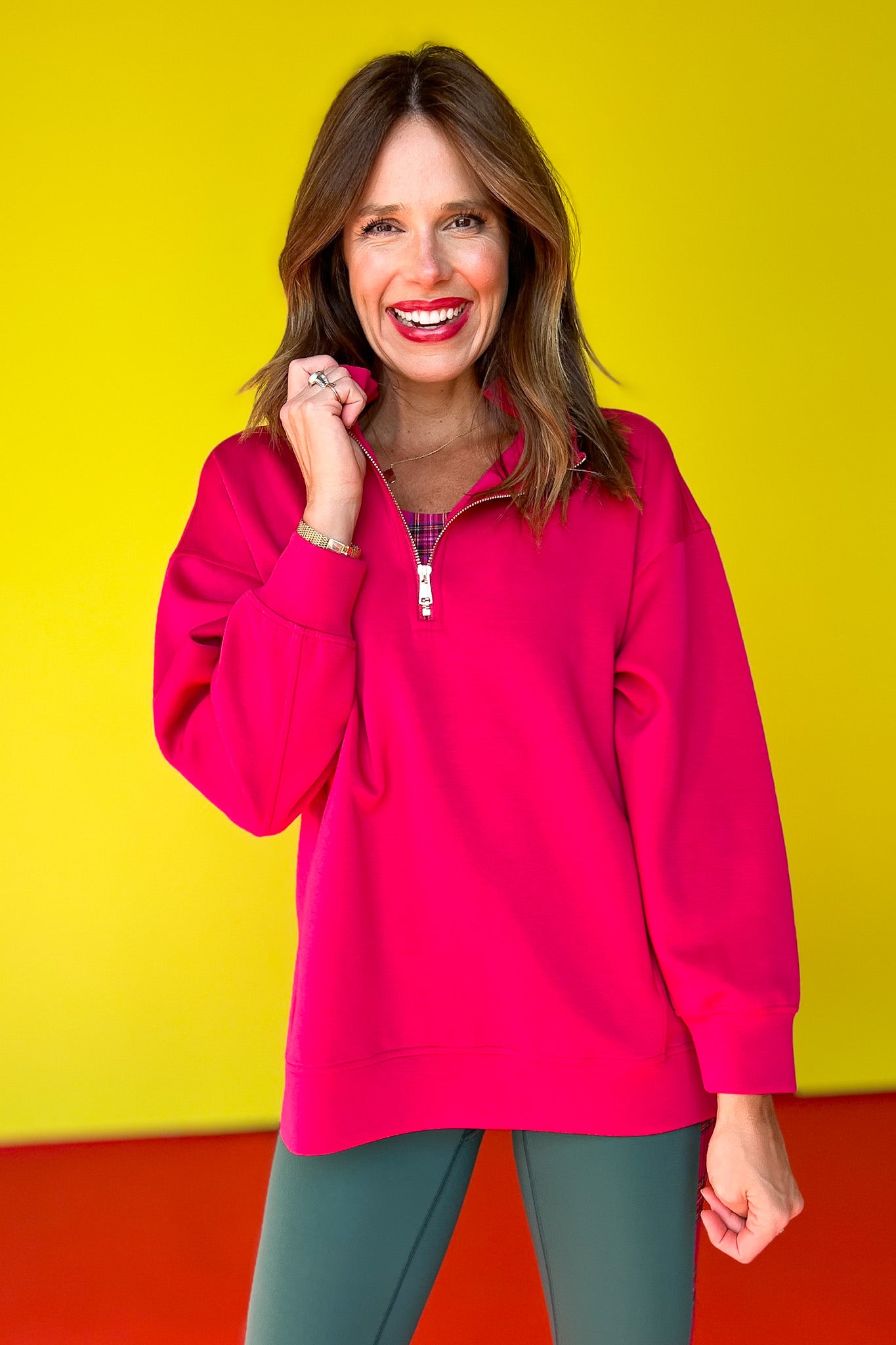 Our TOP SELLING pullover is BACK and we are calling her the ELEVATED BIG SISTER! Introducing the SSYS Ruffle Collar Ainsley Air Pullover In Pink! Ainsley features a new ruffle pleated collar you know and love that will take your athleisure or everyday look up 10 levels! She is made from the same dreamy air fabric that is so comfortable and so chic. Build a festive ensemble by pairing with the SSYS Pink Tartan Plaid Sports Bra and the SSYS Pink Tartan Plaid Inset Hunter Green High Waist Leggings! STOP IT RIGHT NOW, SO GOOD!!!