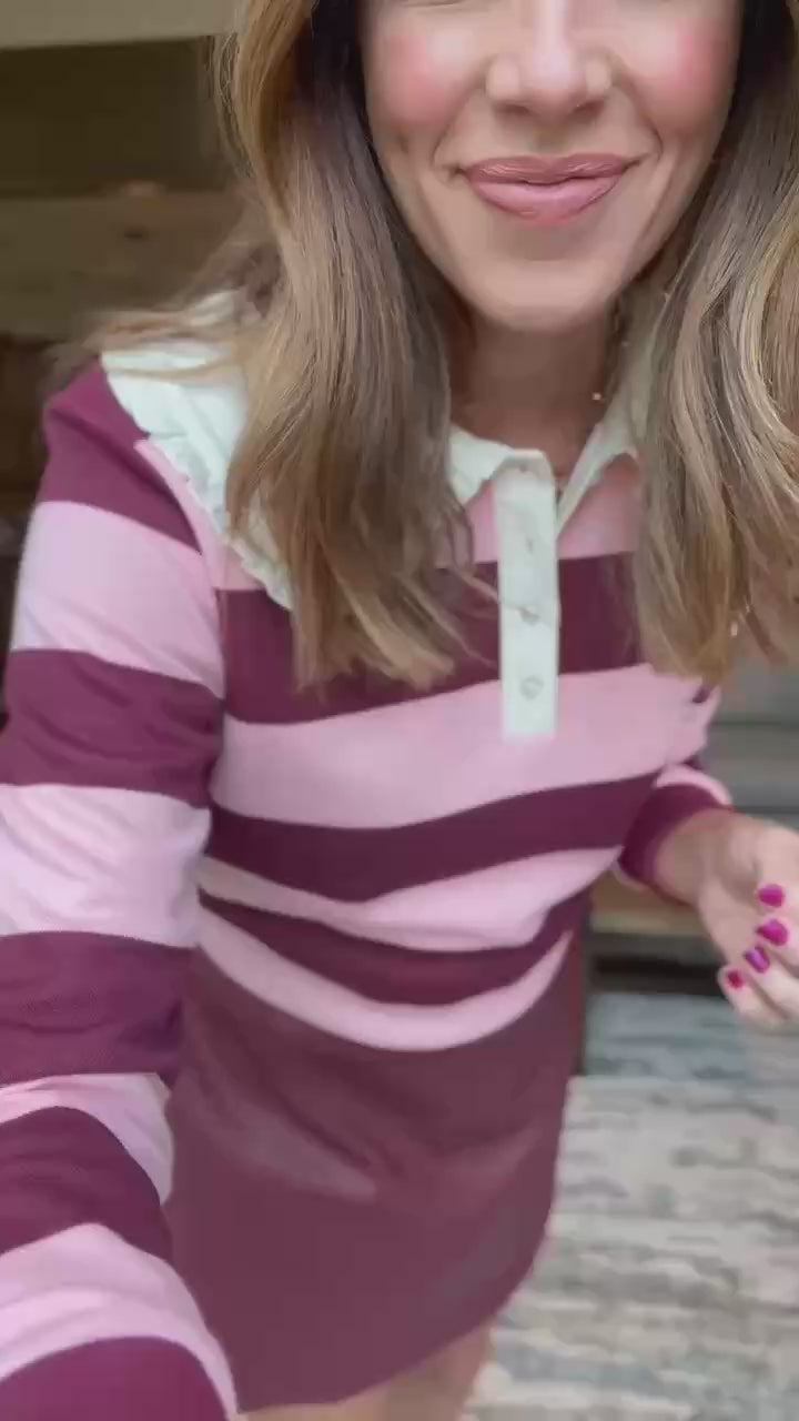 Classic stripes meet modern charm with the Skye Stripe Top in Pink Maroon by SSYS The Label. Designed in a bold pink and maroon stripe pattern, this top features a collared neckline with button detailing and subtle ruffle trim for a feminine twist. Crafted in a soft, breathable knit, it’s comfortable enough for everyday wear while polished enough for elevated styling.