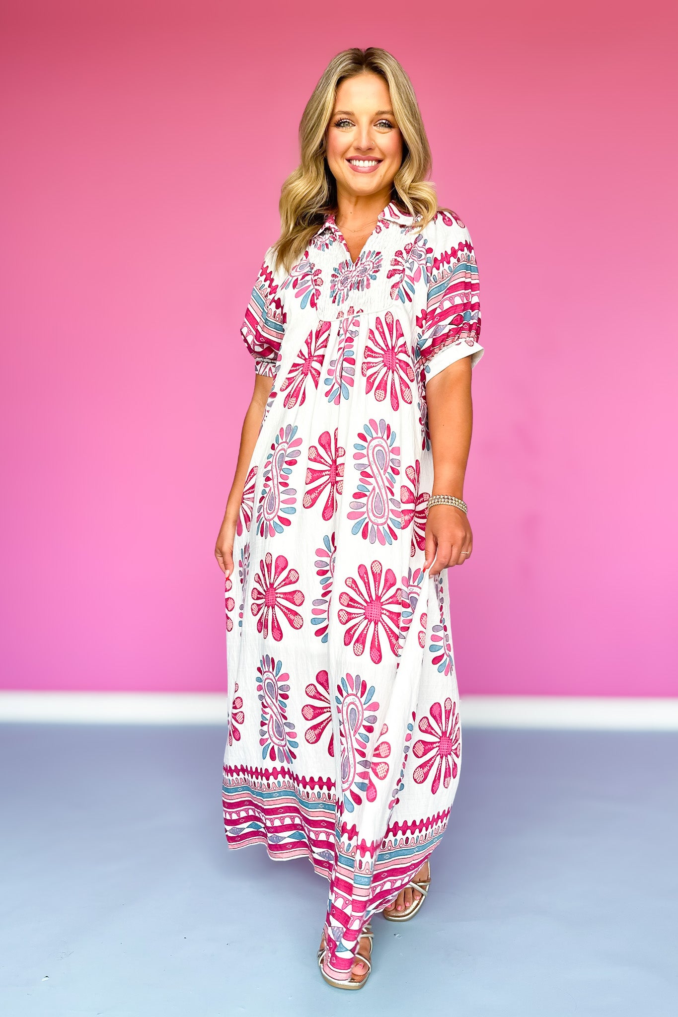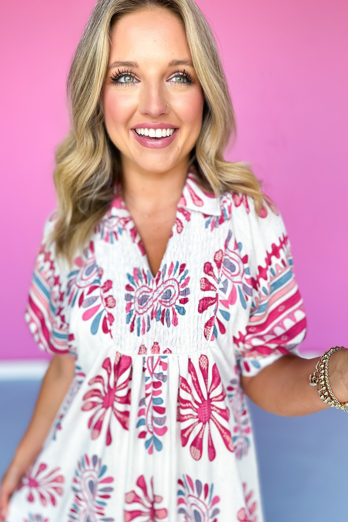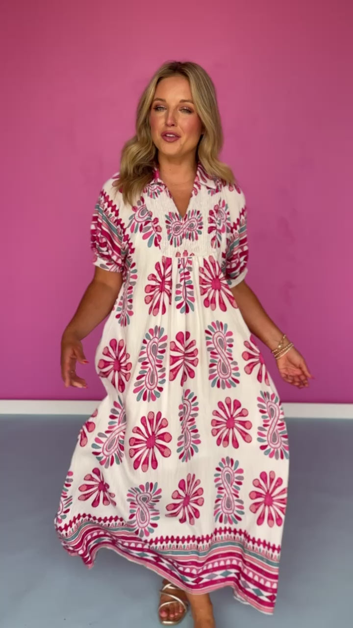 Pink Printed Smocked Yoke Balloon Sleeve Midi Dress
