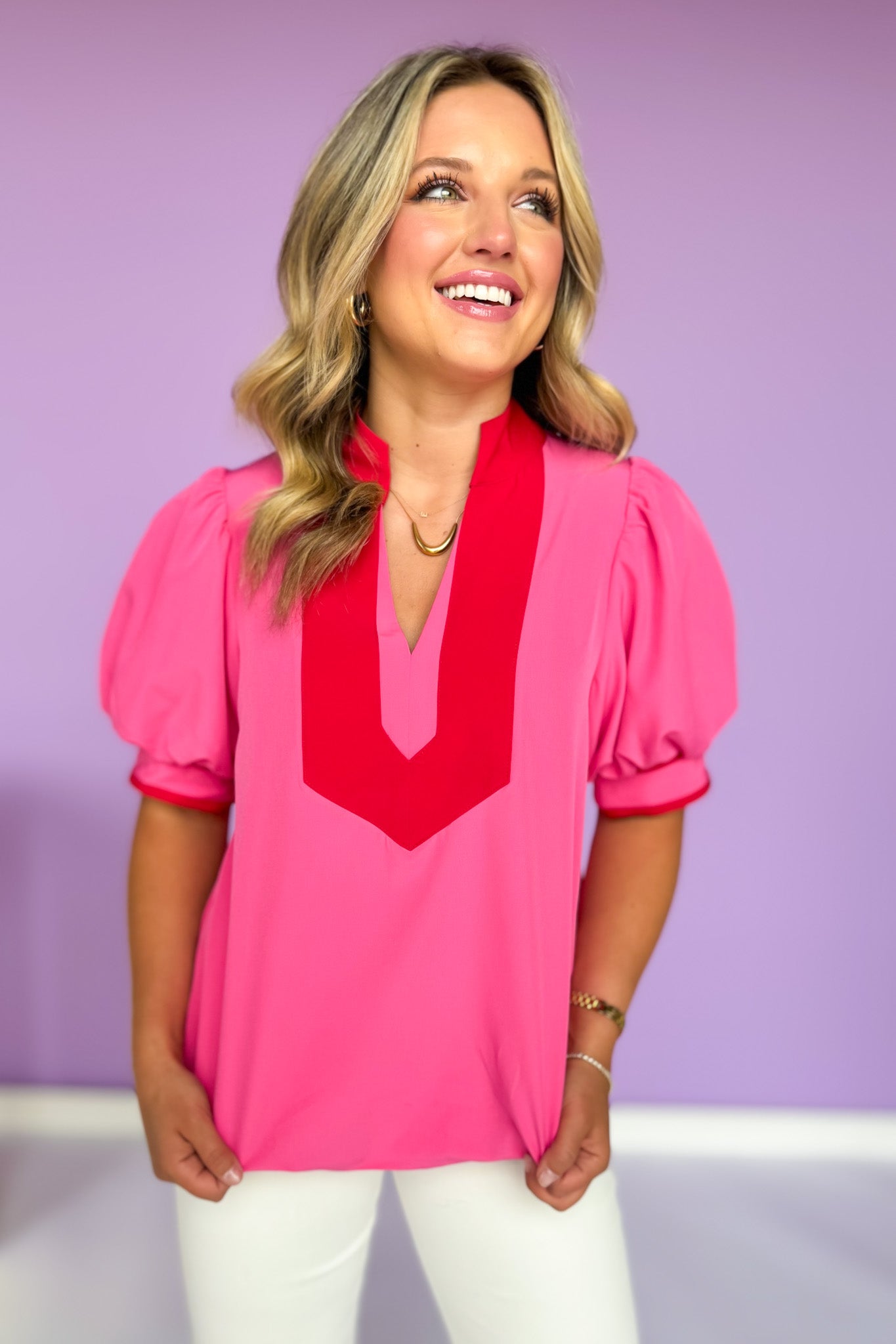 Elevate your style with this eye-catching Pink Short Bubble Sleeve Top! The playful bubble sleeves add a touch of whimsy while the contrast high neck creates a sophisticated silhouette. Perfect for adding a pop of color to your wardrobe, this versatile piece transitions effortlessly from office to evening. Pair with your favorite jeans or skirt for an instantly put-together look that's sure to turn heads! Shop our BOTTOMS and SHOES to create an effortless ensemble!