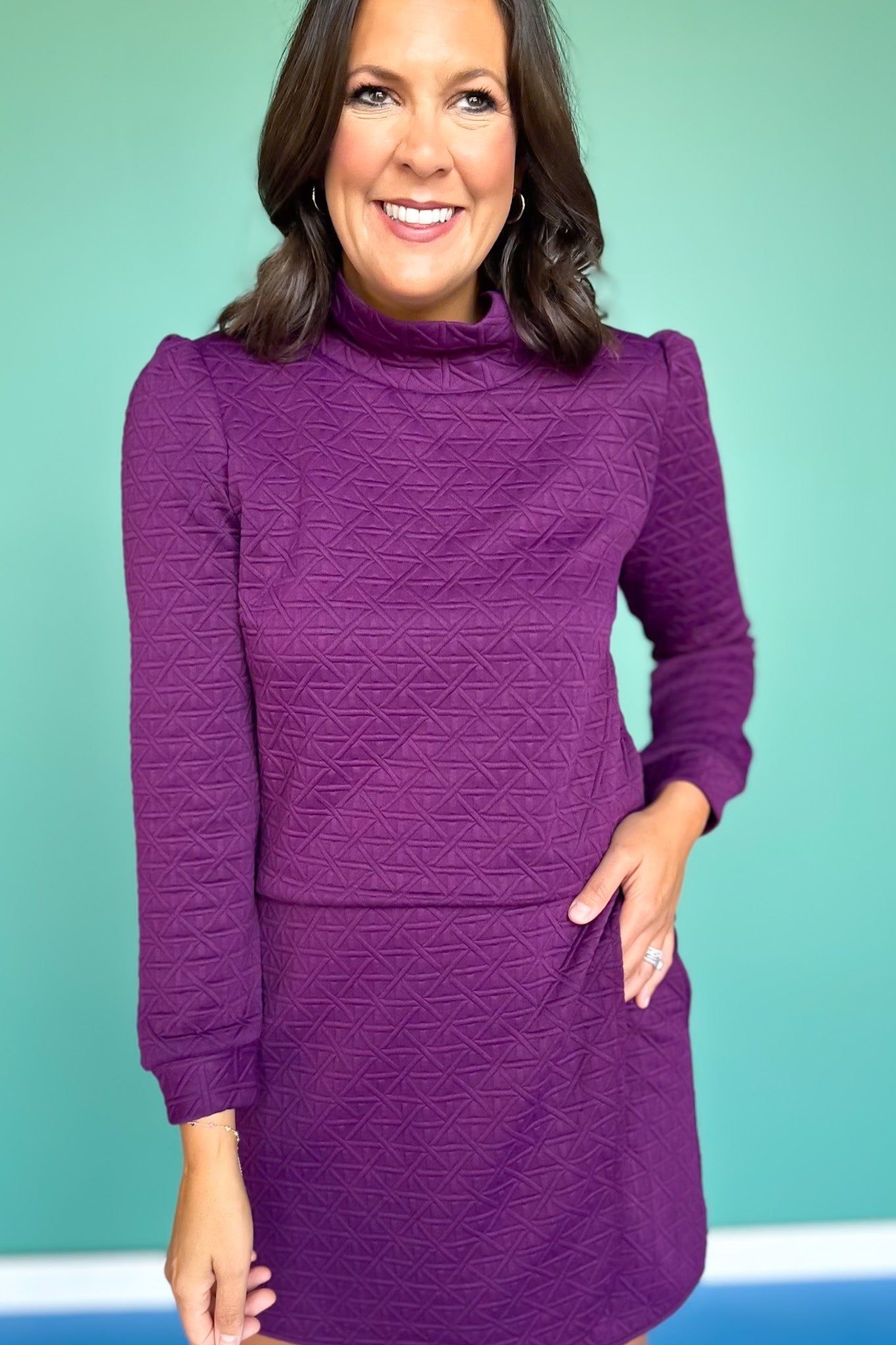 Turn heads with the SSYS Faith Lattice Set in Plum, a chic two-piece outfit that blends comfort, texture, and versatility. Crafted from a soft quilted lattice fabric, this matching set features a mock-neck top with subtle puff sleeves and a coordinating skirt that skims effortlessly for a flattering fit. The textured design adds a modern edge, while the clean silhouette keeps it timeless.