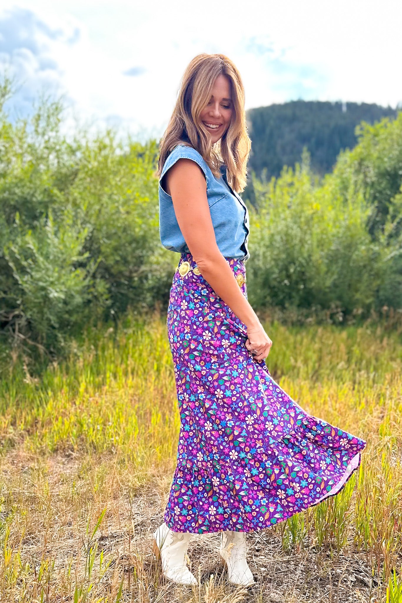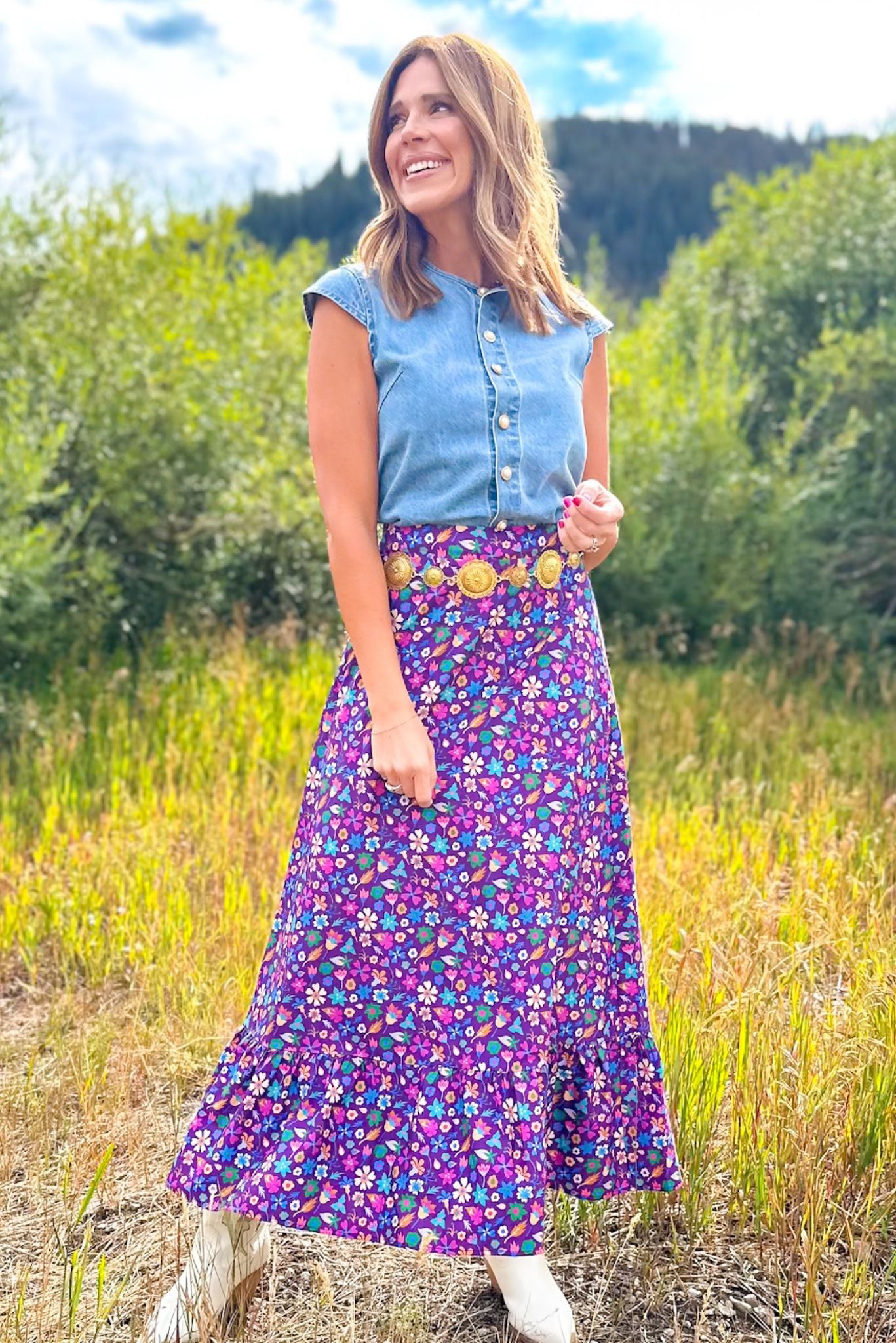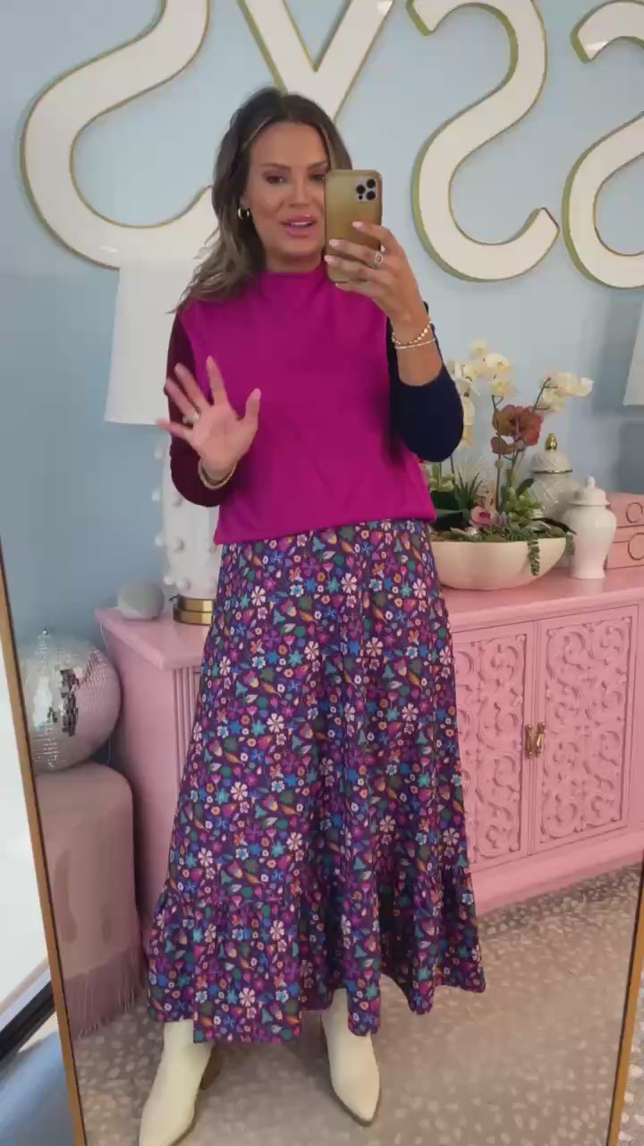 Help us welcome the SSYS Daisy One Tier Maxi Skirt In Purple Floral to your closet! Daisy is a grown up version of our SSYS Sadie skirt. She features a long and lean silhouette all the way down ending with a ruffle hem and fully lined. She includes a elastic back, flat front and zipper on the side that is a great length and fit for any shape and size. Don't skip on DAISY, she is a MUST-HAVE! We love her styled with the SSYS Lauren Denim Top for a chic styled look.
