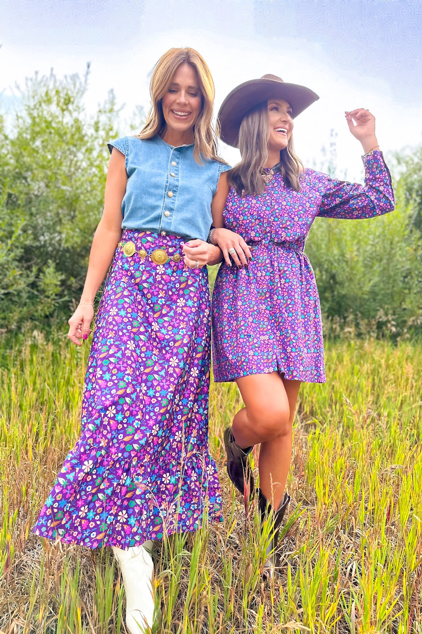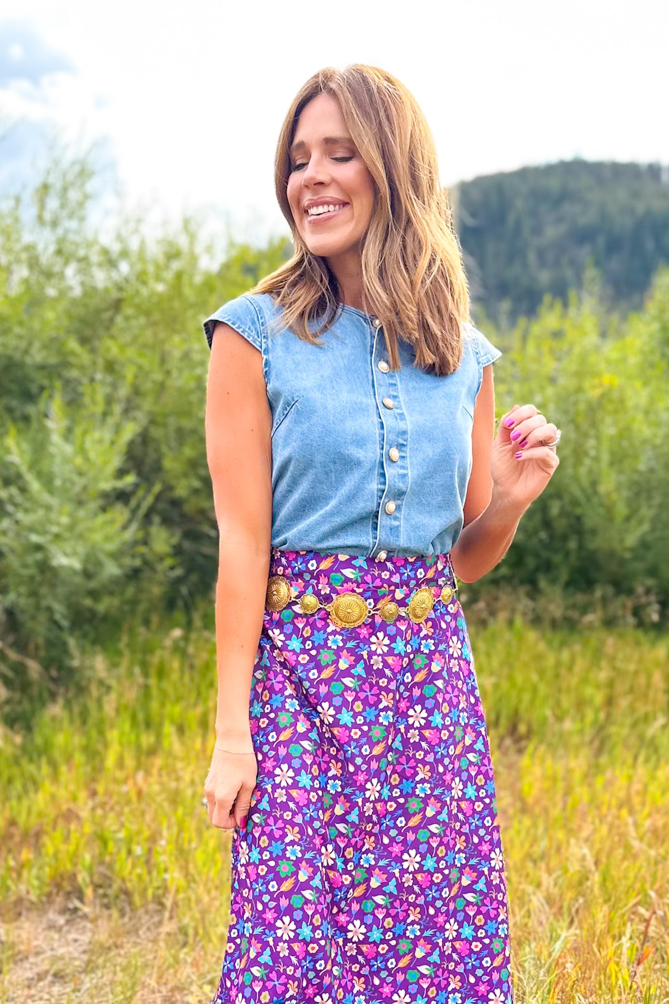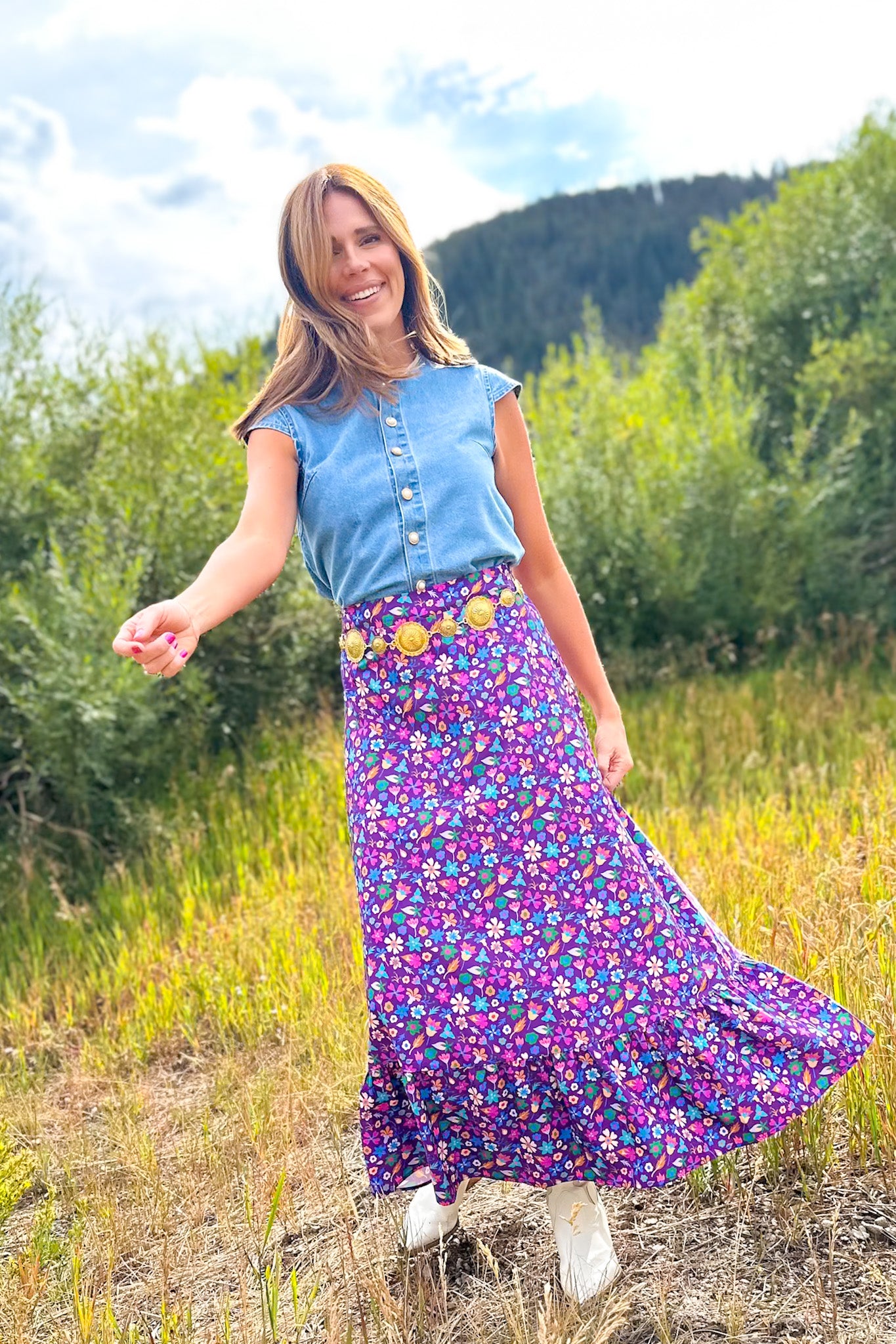 Help us welcome the SSYS Daisy One Tier Maxi Skirt In Purple Floral to your closet! Daisy is a grown up version of our SSYS Sadie skirt. She features a long and lean silhouette all the way down ending with a ruffle hem and fully lined. She includes a elastic back, flat front and zipper on the side that is a great length and fit for any shape and size. Don't skip on DAISY, she is a MUST-HAVE! We love her styled with the SSYS Lauren Denim Top for a chic styled look.