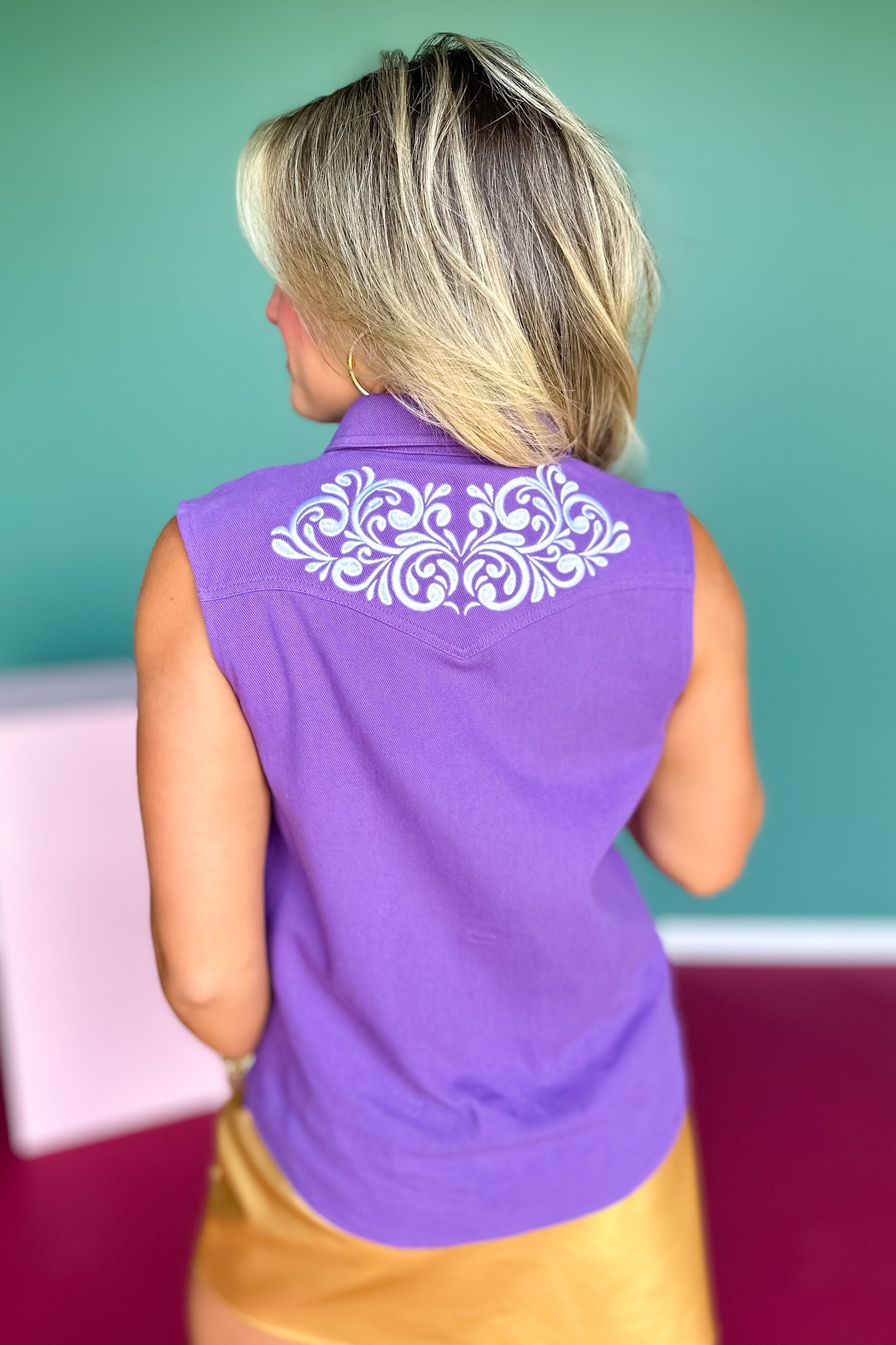 Say HELLO to the SSYS Edith Sleeveless Denim Embroidered Top in Purple — a western inspired yet polished favorite for the fall season. Made from breathable lightweight denim, this sleeveless silhouette is adorned with a one-of-a-kind embroidered design and pearl buttons for an effortlessly elevated touch! This top is your go-to for standout versatility—whether you're in the stands, on the concert lawn, or out on the town. Create a concert or game day ready look by pairing with our SSYS Arden Denim Skort In Ivory and boots. This piece NEEDS in your closet ASAP!