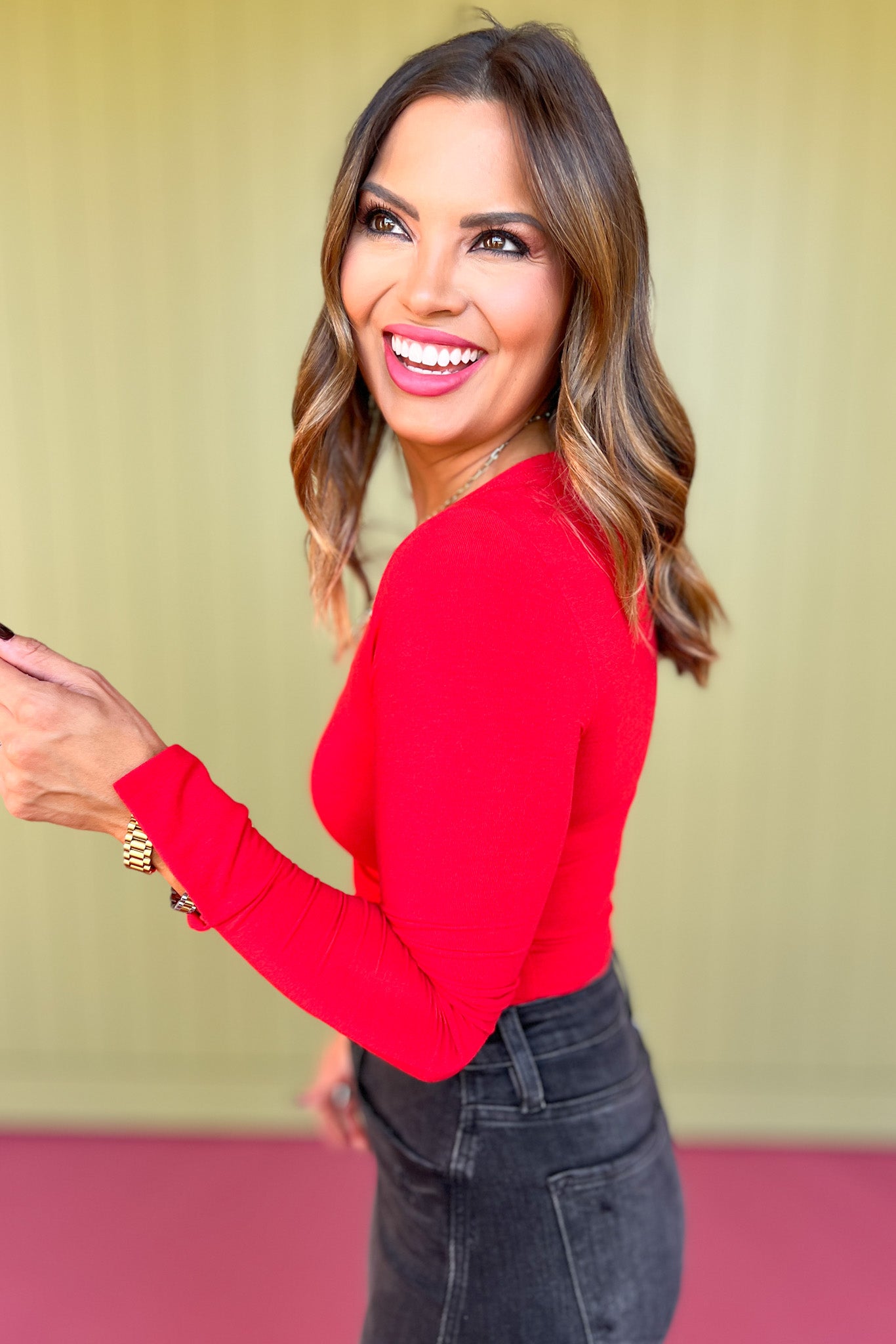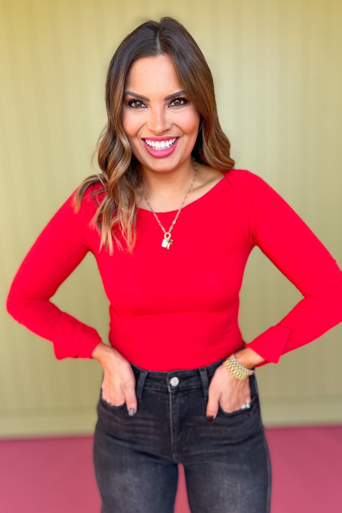 Sophisticated Chic is the vibe of our Red Boat Neck Long Sleeve Top! This stylish top features a flattering boat neck neckline and long sleeves for a sleek look. Perfect for any occasion, this top will keep you feeling comfortable and looking chic all day long. Elevate your look by shopping our BOTTOMS and SHOES to build your new OOTD!
