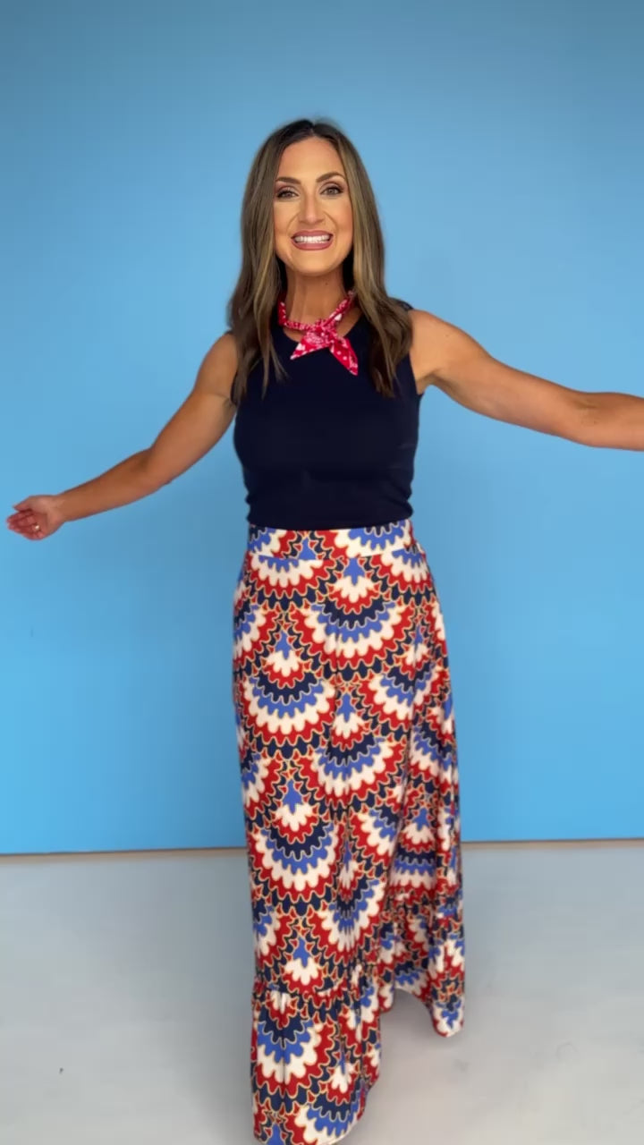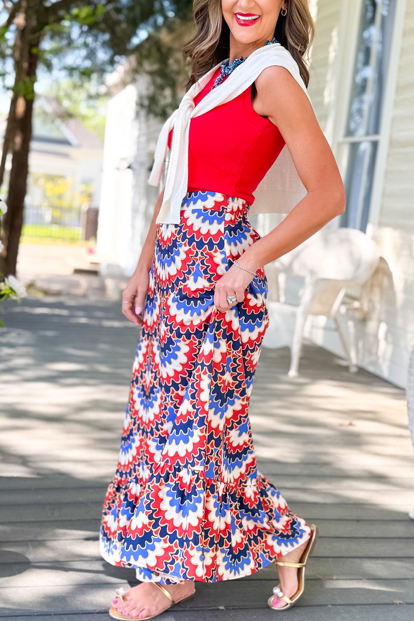 NEW PRINTS are HERE!!! Help us welcome the SSYS Daisy One Tier Maxi Skirt In Red Bunting to your closet! Daisy is a grown up version of our SSYS Sadie skirt. She features a long and lean silhouette all the way down ending with a ruffle hem and fully lined. She includes a elastic back, flat front and zipper on the side that is a great length and fit for any shape and size. Don't skip on DAISY, she is a MUST-HAVE! We love her styled with the SSYS Ribbed Crew Neck Sleeveless Tank In Red for a fabulous AMERICANA ensemble that will create fashion envy at all your Memorial Day and 4th of July events! Shop our SHOES and ACCESSORIES to polish off your look!