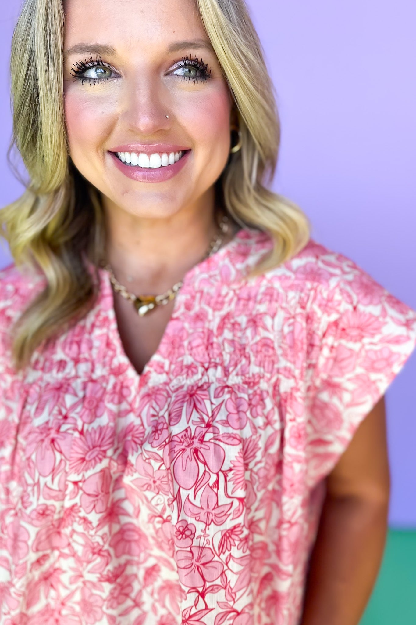 Elevate your everyday style with our Red Floral Print V Neck Smocked Bodice Top. This top features an orchid floral print and a smocked bodice for a flattering fit. Perfect for any casual occasion, add a pop of color to your wardrobe with this versatile top. Style with denim or shorts for an effortless look! Shop our BOTTOMS and SHOES for your perfect ensemble!