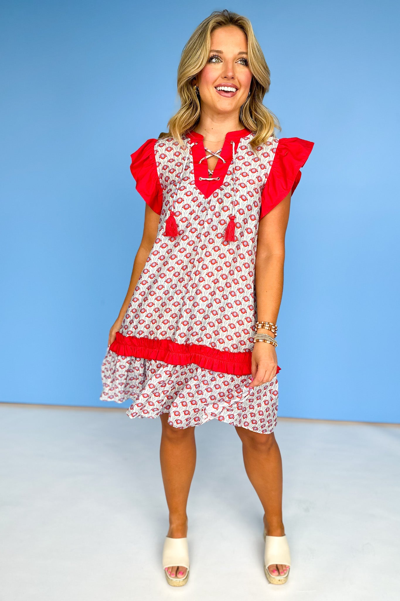 Get ready to turn heads in this Red Printed Contrast Ruffle Sleeve Tiered Dress! With its playful ruffle sleeves and tiered design, this dress adds a touch of fun to any occasion. The contrast and print adds a unique twist, making this dress a must-have for any fashion-forward individual. Shop our in stock and versatile collection of TOPS and SHOES to build your multiple looks!