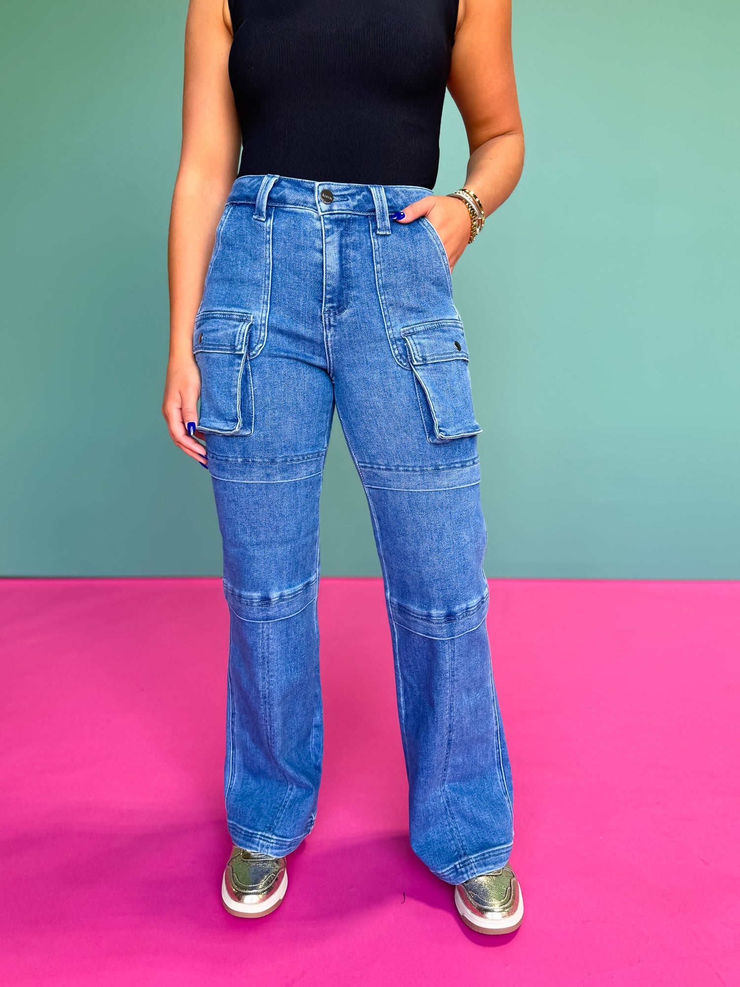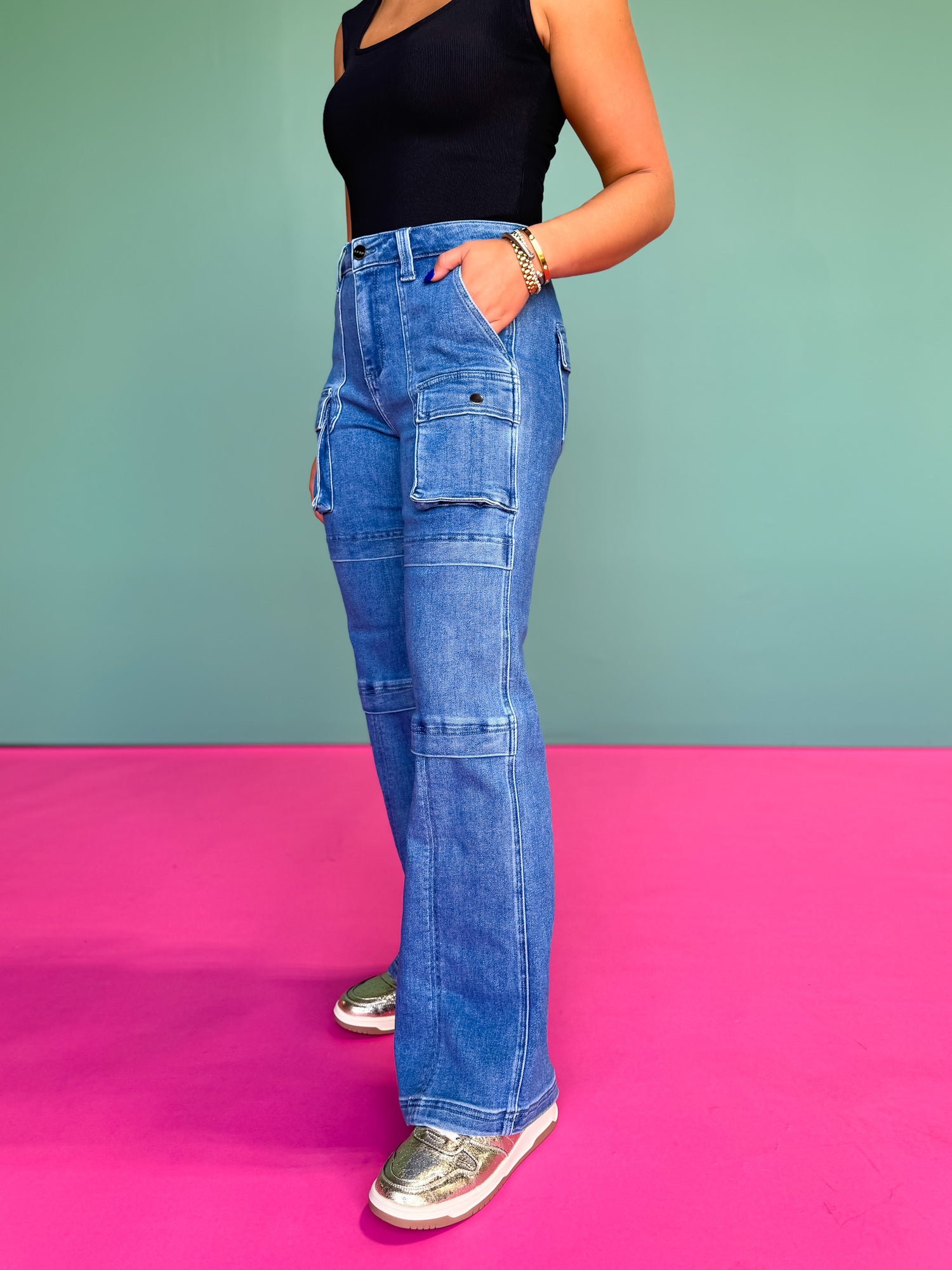 Up your denim collection with the Risen Medium High Rise Straight Cargo Jeans. These trendy jeans feature a high rise waist and straight leg fit, perfect for a stylish and comfortable look. With added cargo pockets, you'll have everyone asking where you got these! Pair with sneakers and a collared poplin for a casual look or dress up for a trendy date night.