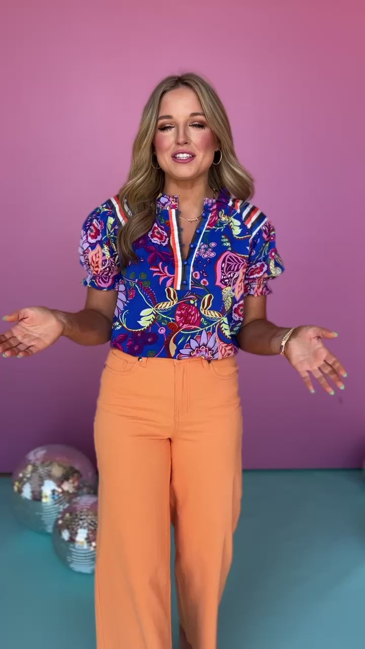 Elevate your throw and go tops with this playful and detailed Royal Multi Print Frill Neck Top. Featuring a multi stripe detail and floral print, a flirty frill neckline, and a trendy curved hem, this top will stand out amongst the others in your wardrobe. Style with white denim and platform wedges for a causal Friday at the office and get ready for the compliments!