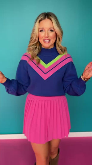Bold color and cozy comfort combine in the Aspen Mock Neck Sweater in Royal by SSYS The Label. Designed with a striking geometric color pattern in pink and lime, this sweater adds modern flair to your cool-weather wardrobe. The mock neck and relaxed fit make it both chic and comfortable, while ribbed cuffs offer a polished finish.