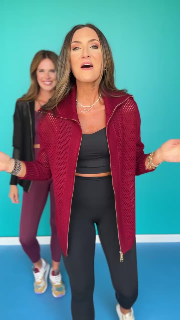 BRAND NEW SILHOUETTE coming at you in our luxe crochet sweater fabric y'all already love! Introducing the SSYS Exaggerated Collar Crochet Knit Zip Up Sweater In Black! Featuring an exaggerated collar, signature luxe gold zipper, and full seat coverage with the length. Designed to layer over your SSYS The Label Athleisure but can also be elevated with DENIM! Simply LUXE and checks EVERY BOX!