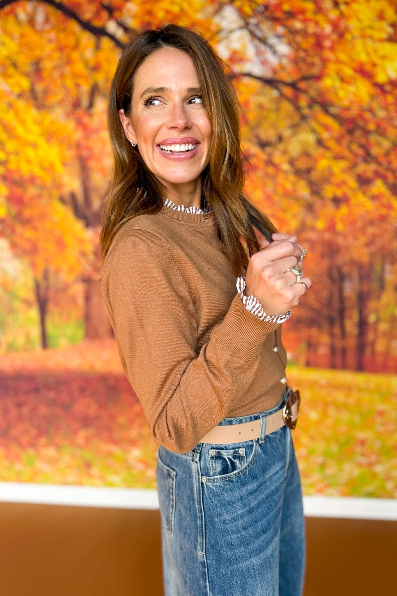 Classic meets cozy in the SSYS Gentry Layered Cardigan in Brown by SSYS The Label. This effortlessly chic cardigan gives the illusion of layered styling with its contrast gingham collar and cuff details, making it a standout piece for your fall wardrobe. Crafted in a warm caramel-brown knit with gold button accents, it offers timeless sophistication with a modern twist.