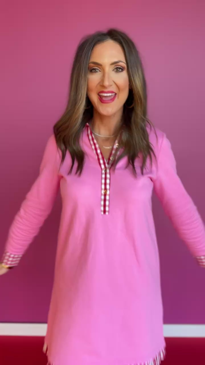 The SSYS Kay Gingham Ruffle Contrast Long Sleeve Dress In Pink is the perfect blend of classic charm and romantic style. Designed by SSYS The Label, this darling dress features a soft pink body accented with playful gingham trim along the collar, cuffs, button placket, and flirty ruffle hem that adds a sweet touch to your Valentine's Day wardrobe.