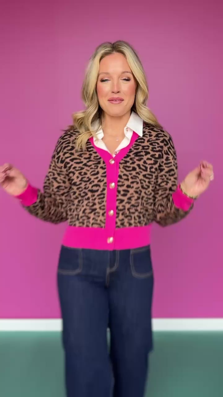 A little wild, a little playful — the SSYS Maddie Animal Cardigan brings bold personality to your cozy layers. This standout cardigan features a chic leopard print body paired with vibrant hot pink trim for the perfect pop of color. The contrast cuffs, hem, and button placket elevate the classic animal print with a fun, fashion-forward twist.