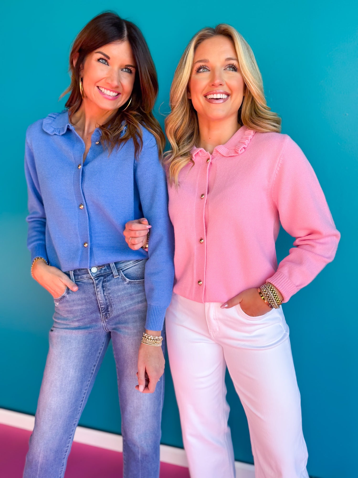 Shop our MAEVE RUFFLE COLLAR CARDIGAN IN PINK and MAEVE RUFFLE COLLAR CARDIGAN IN ICE BLUE for more stunning colorways!