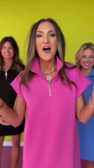 Introducing the SSYS Pleated Hem Taylor Air 3/4 Zip Dress in Pink. She is so versatile and will be a year round piece that you will gravitate to time and time again. She is made from the air fabric that we are all obsessed with, has a cap sleeve, functional and signature gold zipper that can be zipped up for a funnel neckline or open collar look and we added a pleated hem for a feminine touch. Your new best friend is tailored, chic, comfortable and elevated! Don't miss out on her! Shop our collection of SHOES and ACCESSORIES to complete your ensemble!