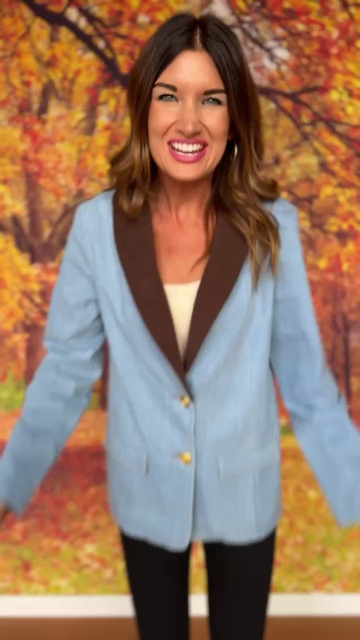 Elevate your everyday style with the Presley Denim Blazer by SSYS The Label — a modern take on a timeless classic. Crafted from soft chambray denim, this structured yet relaxed blazer combines effortless polish with casual sophistication. The contrasting chocolate brown corduroy lapel adds a chic, fall-ready touch, while the gold button details lend a hint of luxury.