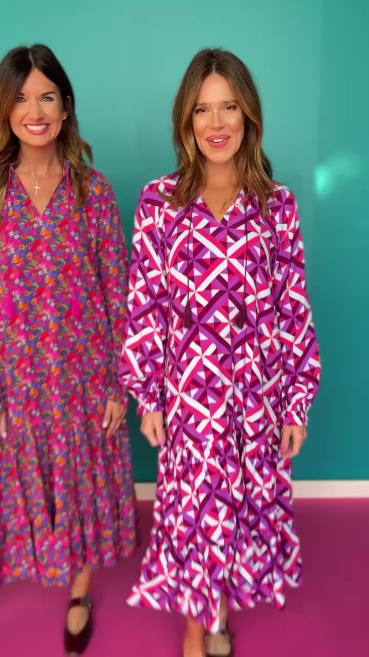 Elegant, effortless, and endlessly wearable, the Rowan Long Sleeve Maxi Dress in Bright Floral by SSYS The Label is designed for every occasion. Featuring a floral print in a rich bright hues, this dress combines a relaxed silhouette with feminine details. The V-neckline with tassel ties, tiered skirt, and flowy long sleeves make it both comfortable and chic.