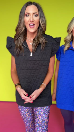 Shop our BLACK QUILTED RUFFLE SHOULDER HALF ZIP PULLOVER for another stunning colorway!