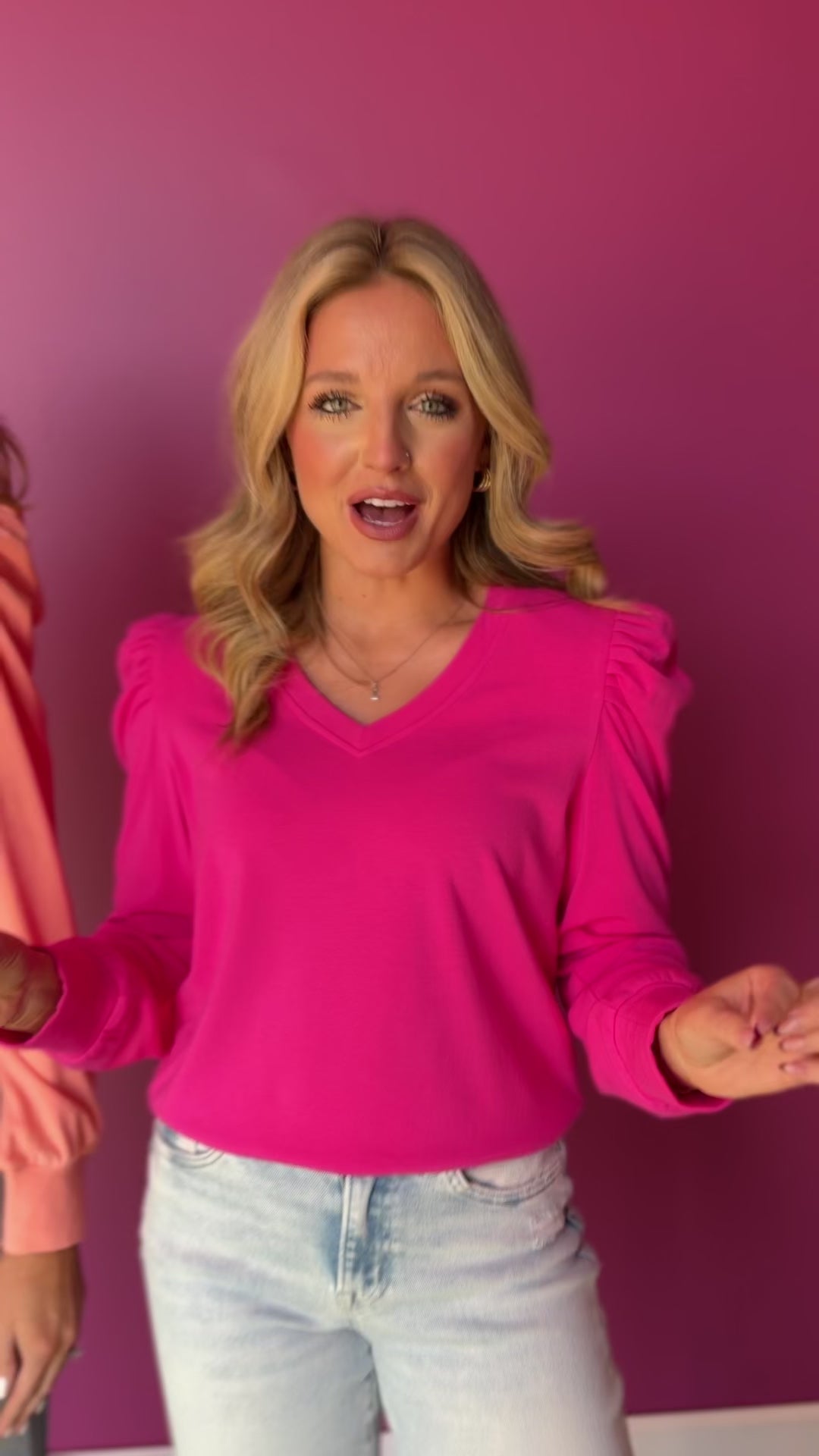 The SSYS Sarah V Neck Long Puff Sleeve Top In Hot Pink is the perfect blend of feminine charm and effortless style. Designed by SSYS The Label, this versatile top features a soft rayon-spandex blend in a vibrant hot pink hue with a flattering V-neckline and long puff sleeves that add a romantic touch to any outfit.