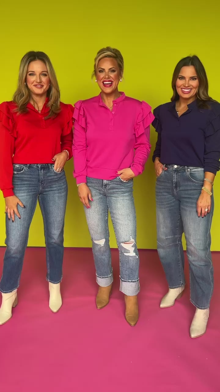 NEW silhouette that is totally ADORABLE! Introducing the SSYS Libby Ruffle Shoulder Button Long Sleeve Top In Hunter Green! Featuring a ruffle shoulder and button front that can be dressed up or down. The show stopping piece is the comfort level, talk about PERFECTION! Libby is elevated, sophisticated and effortless! She will be on REPEAT in your closet. Style with your fave pair of denim and you are out the door in comfortable style! Shop our DENIM and SHOES to elevate your effortless look!
