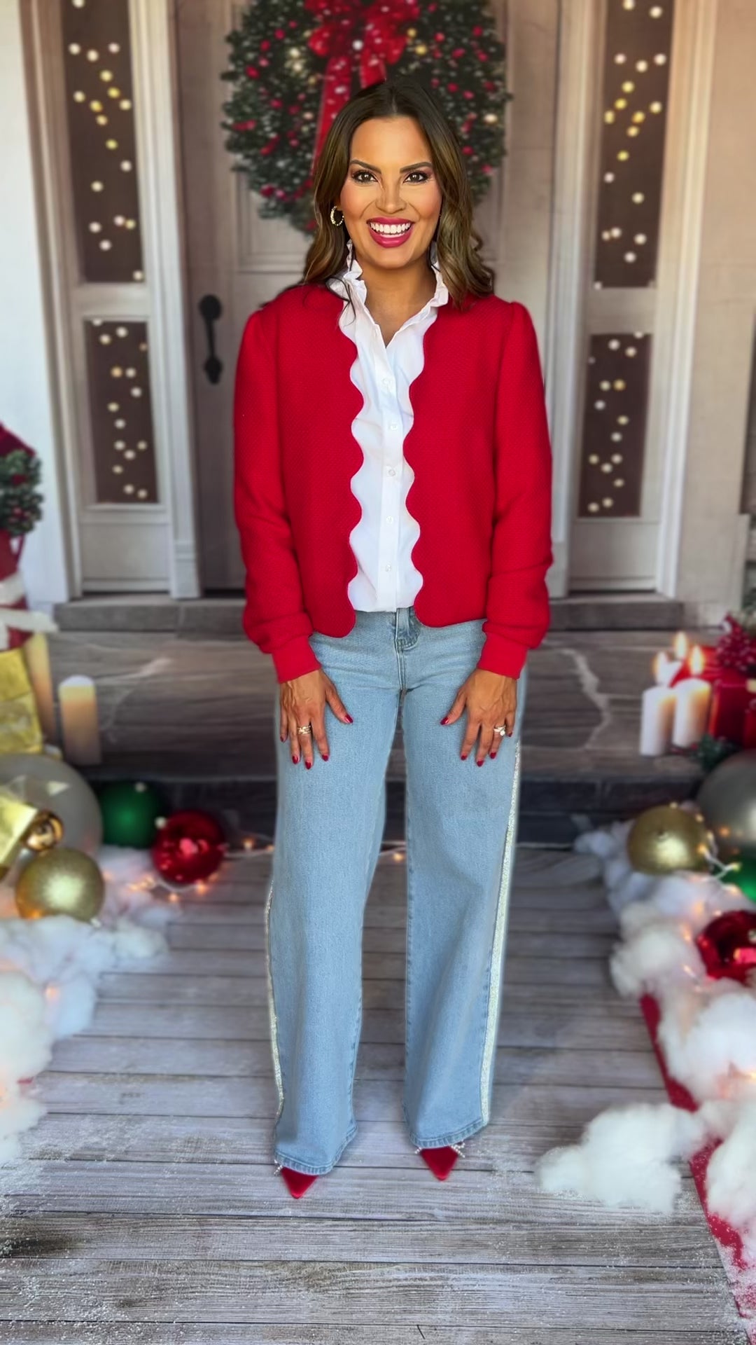 OBSESSION ALERT!!! Introducing our SSYS The Nicole Rhinestone Stripe Wide Leg Denim Trousers! Welcome SSYS The Nicole into your closet for the holidays and rotate her into your wardrobe throughout the year. Embellished with a rhinestone stripe down the leg, she will add some sparkle and shine to your festive look! Style her with the SSYS The Greta Poplin Ruffle Neck Button Down In White and the SSYS The Belle Textured Scallop Open Blazer In Red to create a combo that will bring Christmas Joy to all around! How fabulous would this combo be for all your child's school holiday programs?! SO CHIC!