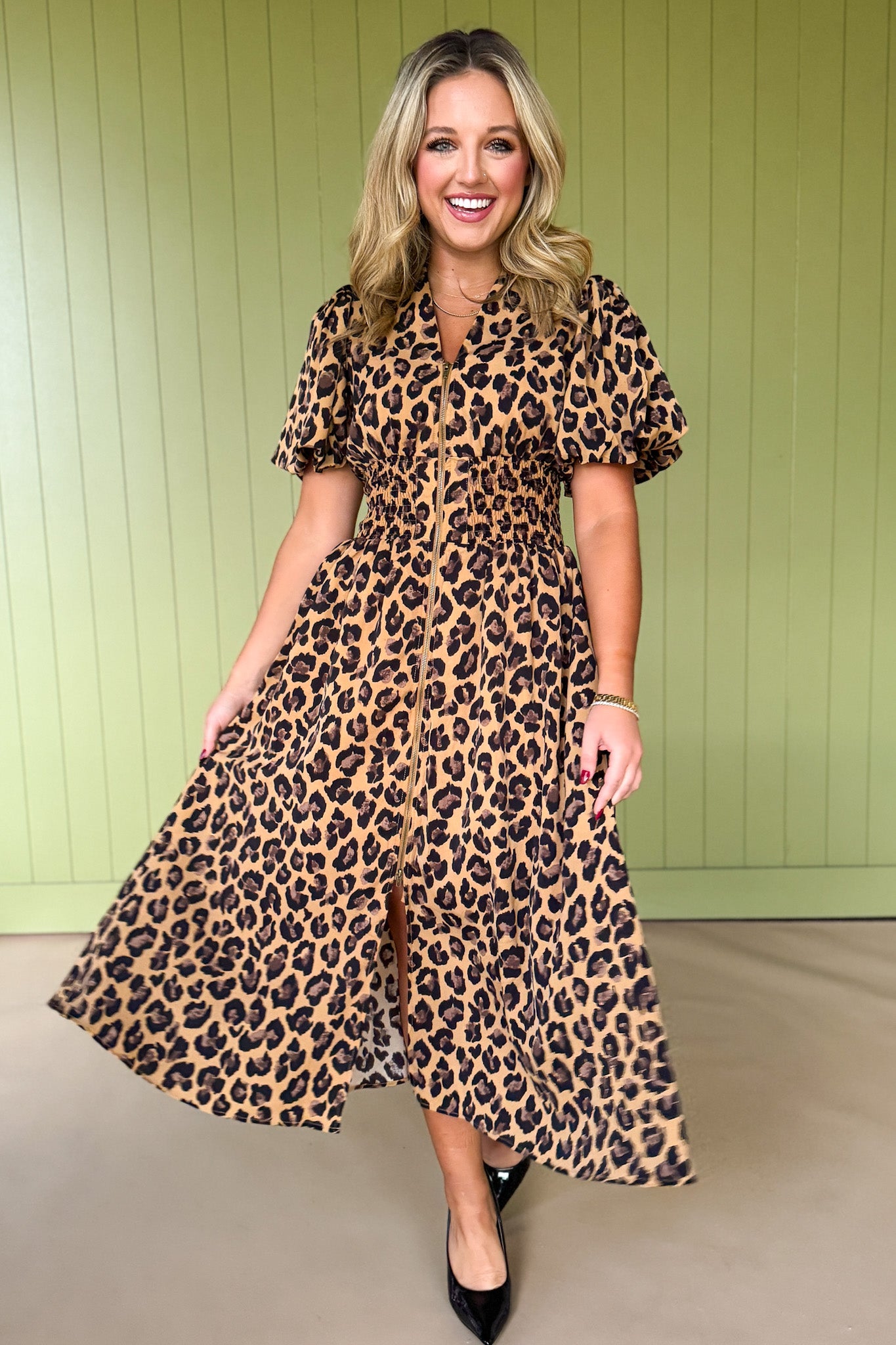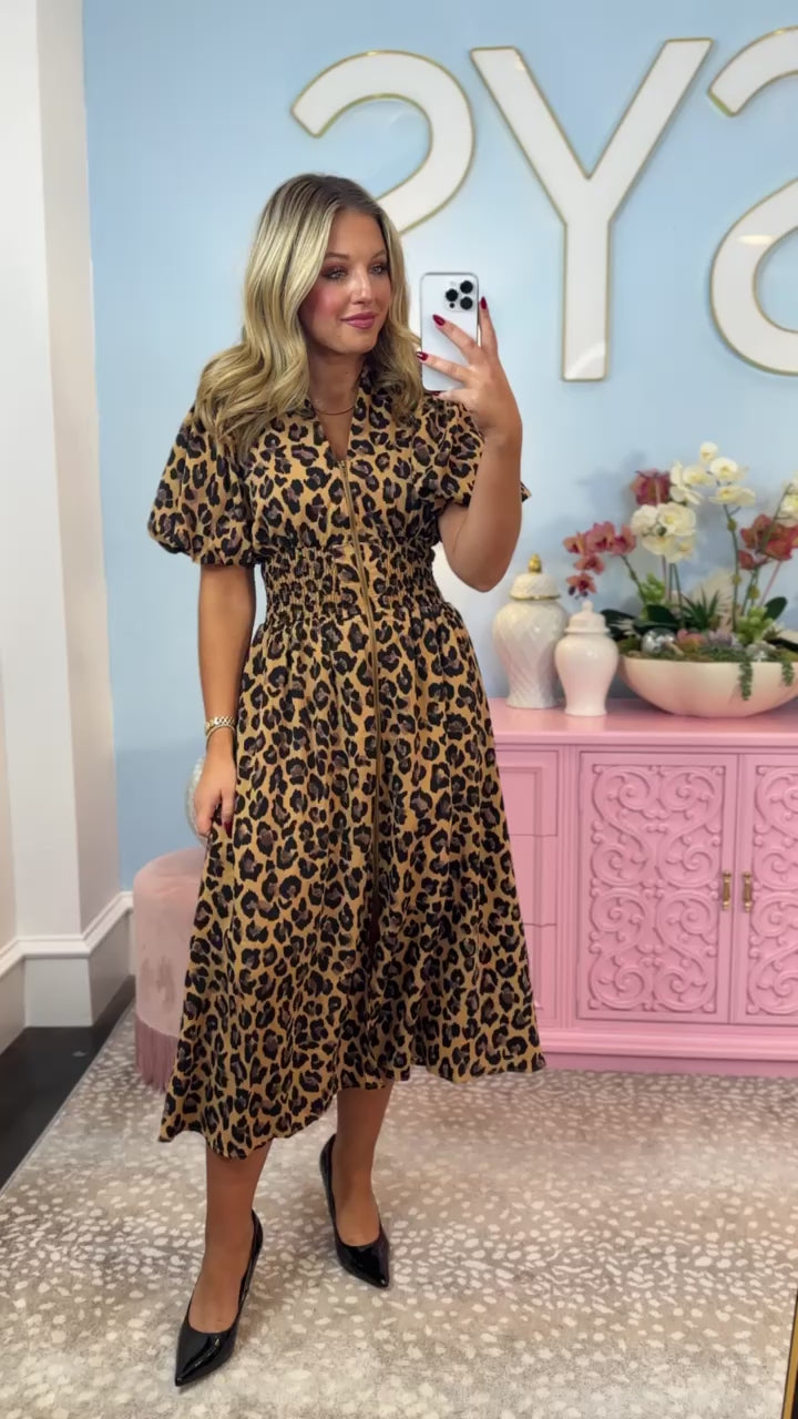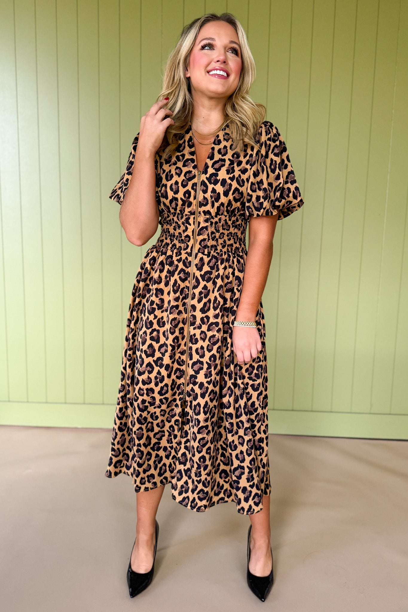 Get ready to unleash your wild side with our Tan Animal Print Dress! Featuring a fierce animal print, flattering v-neck, and a unique front zip detail, this dress is perfect for making a statement. Plus, the short puff sleeves add a playful touch to this must-have dress. Don't be afraid to show off your style with this fun piece! Shop our SHOES and ACCESSORIES to polish off your fierce look!