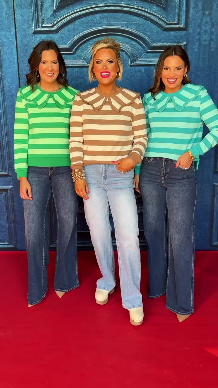 Give a hand clap for BRAND NEW COLORS in SSYS Pippa! Introducing the SSYS The Pippa Striped Peter Pan Collar Sweater In Tan! PIPPA is so FUN, ELEVATED and CHARMING! Featuring trendy bold stripes and a show stopping peter pan collar with ruffle detailing that runs all the way around. The fabrication is a 10/10 for quality and so easy to wear! Style Pippa with your favorite DENIM and elevate her by pairing with heeled booties or keep it casual with sneakers. Get SSYS The Pippa in your closest ASAP!