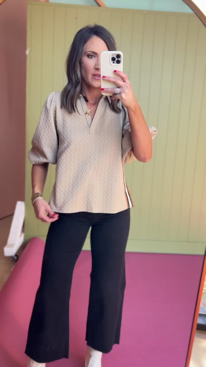 Taupe Textured 3/4 Puff Sleeve Stripe Rib Band Henley Top