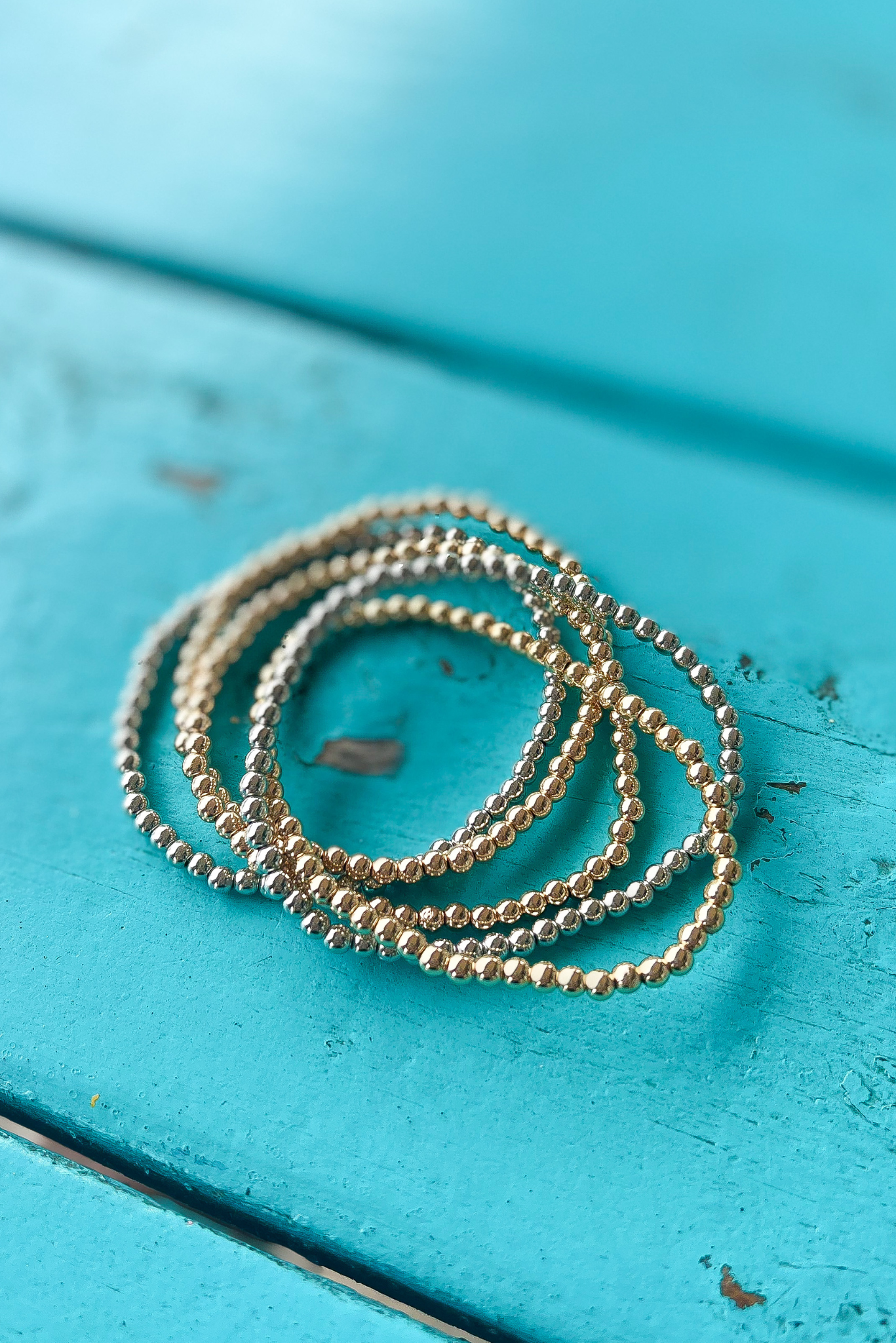 We are in love with the look of this small gold and silver bracelet stack! This thin stack is low-key and so pretty, dress it up or wear it daily and you will love it!
