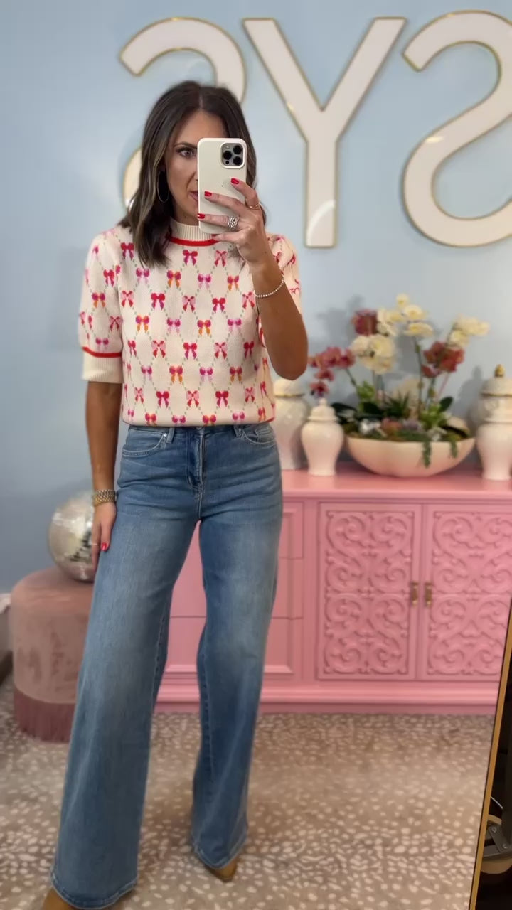 Add a playful touch to your outfit with THML's Cream Knit Ribbon Print Short Sleeve Sweater. The unique ribbon print adds a fun twist to the classic cream knit design. Keep your style on point with this whimsy and versatile piece. Trend-forward without being too serious! Pair with your favorite denim and sneakers and you are out the door! Shop our DENIM and SHOES to style out your look!
