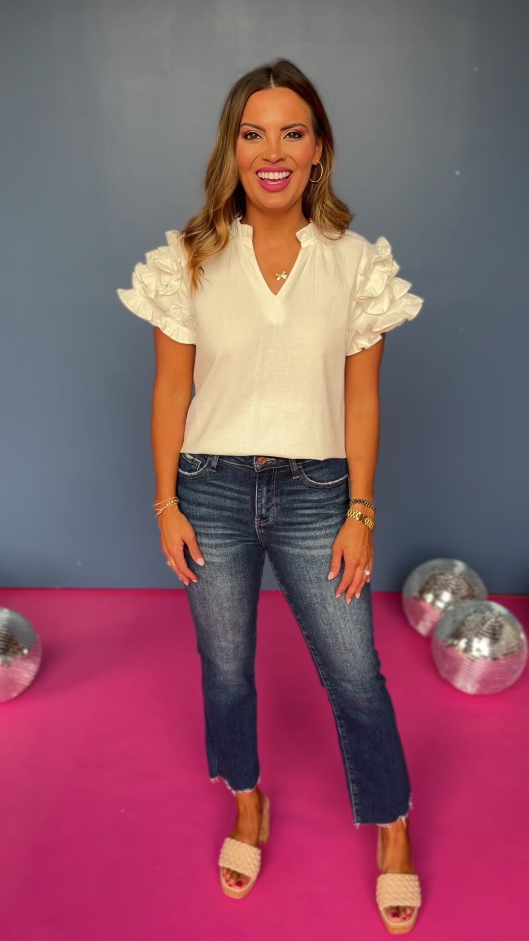 The ruffle sleeves are SASSY and CHIC on this THML White Frill V Neck Ruffle Short Sleeve Top! The frill v-neckline and ruffle sleeves elevate this top to the next level. Pair this piece with your favorite colored denim and get ready to make your entrance! Add this to your rotation ladies, it is worth it!